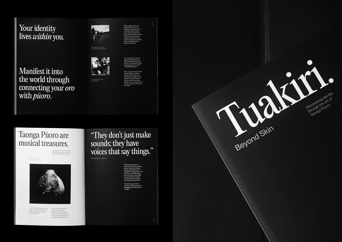 Tuakiri | Beyond Skin is a publication designed to facilitate a hands on, connective experience where participants explore personal identity and its power through a Māori worldview. This journey is facilitated through Taonga Pūoro, Māori musical treasures. These instruments, deeply connected to Atua (gods), Taiao (nature), and Tangata (people), help express inner feelings, uplift, educate, soothe, and heal. They give voice to our identity and teach us about ourselves. The publication guides participants in understanding the meaning and usage of these sacred instruments, empowering them to create their own ukutangi (clay Taonga Pūoro).