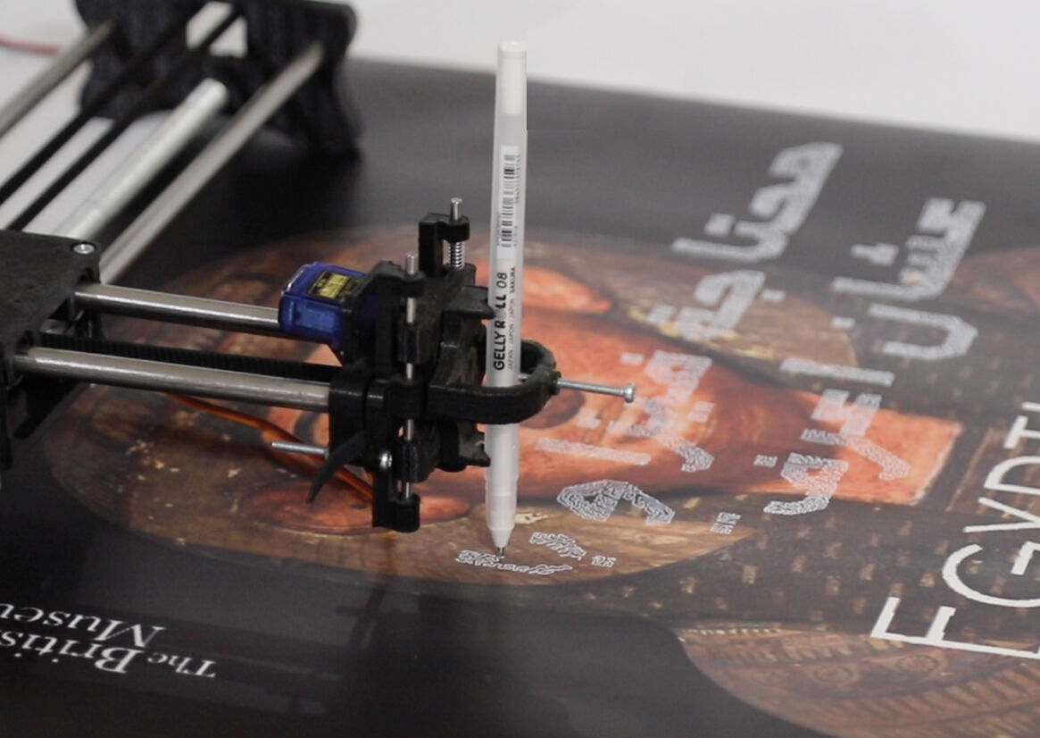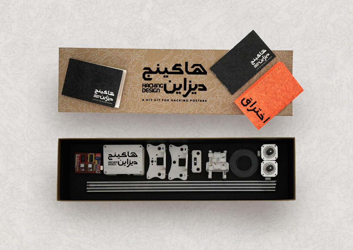 Hacking Design is a DIY kit for designers that allows them to hack or print over existing prints. The kits includes the drawing device and an open source typeface designed for the machine (it’s regular and scribbled alternative). The drawing device comes with a manual that guides the user on how to build the device and install the software. This device was a result of researching the digital and manual aspects of design, and how they can be merged together to produce the best outcome. It combines the accuracy of digital printing to the ink range of manual printing. The typeface Ekhteraq was designed for the drawing device. Ekhteraq is an Arabic open source typeface. It has no contrast and is squared. This gives the typeface a raw aspect and this makes it suitable for adding prominent text over prints. The typeface comes in two styles regular and scribbled. The scribbled version is inspired by graffiti overlaying and the scribbles used on paper when one decides to change existing text. Finally, I used the kit to print posters for a campaign as an application example. The campaign demonstrates how the font and kit could be used. The campaign I created “Da Tarekhna el Masrook” or “This is our Stolen History” is a campaign about Egyptian looted artifacts that are currently displayed abroad. In this campaign, I printed on posters that are used, to market and celebrate our artifacts, abroad to express my anger and frustration. There is a common theme between the kit, Hacking Design, and the campaign, “This is our Stolen History”. That theme is accessibility. Designers should have access to design tools and resources, regardless. Design is not about exclusivity it is about conveying messages. Similarly, Egyptians should have access to their artifacts and art history. History is a crucial factor in our development. Design and history are about the continuity of creation and not starting from scratch.