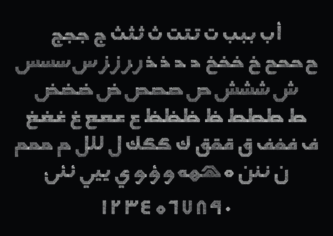 The typeface Ekhteraq was designed for the drawing device. Ekhteraq is an Arabic open source typeface. It has no contrast and is squared. This gives the typeface a raw aspect and this makes it suitable for adding prominent text over prints. The typeface comes in two styles regular and scribbled. The scribbled version is inspired by graffiti overlaying and the scribbles used on paper when one decides to change existing text.
