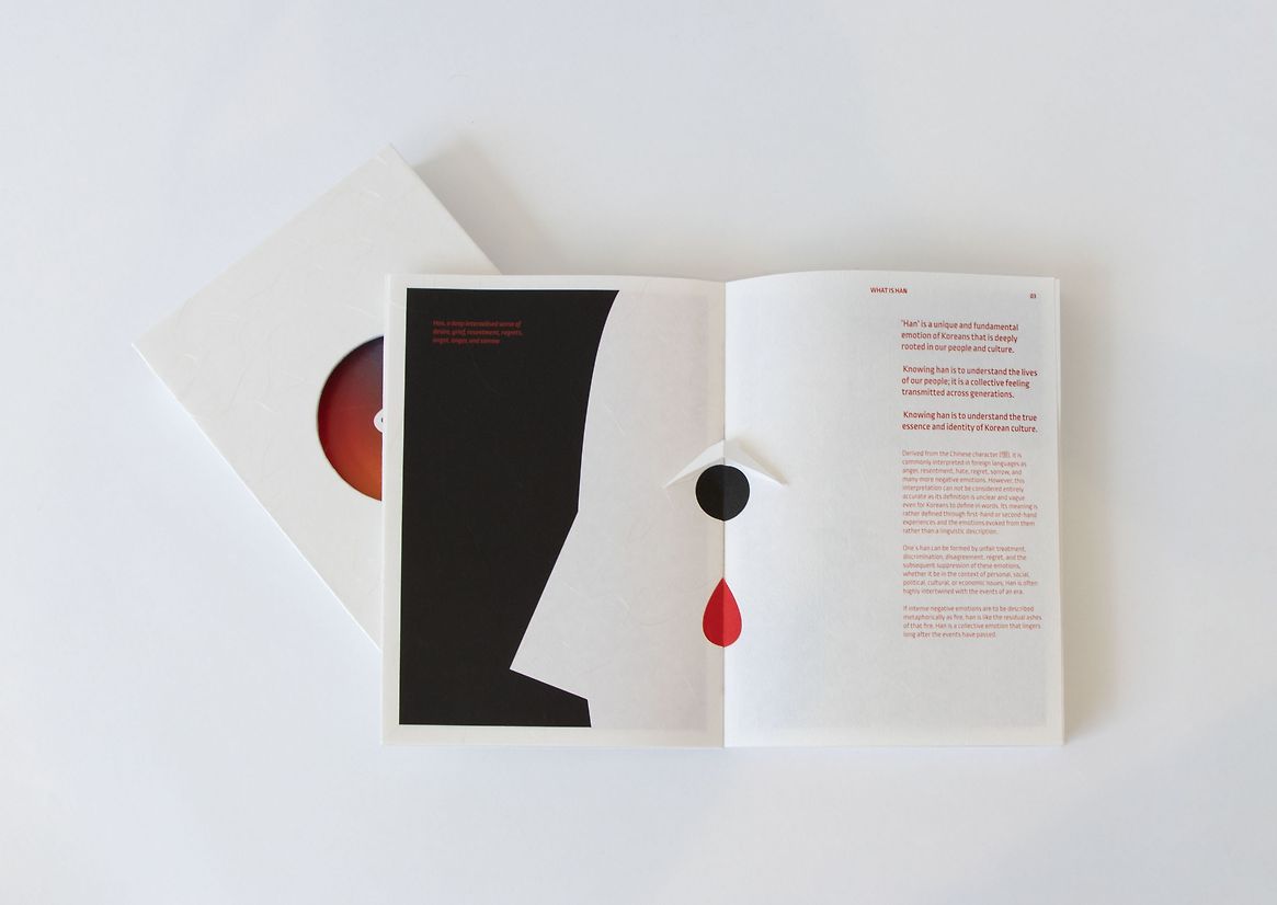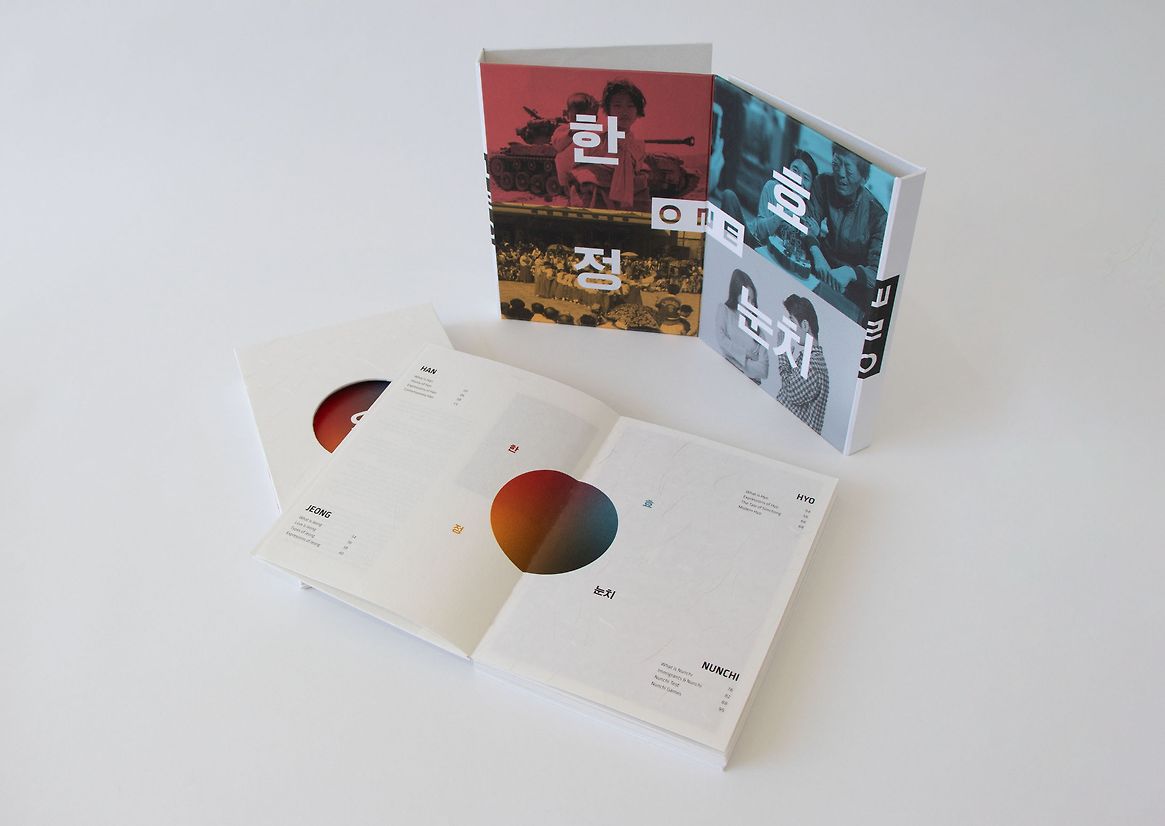 'One' is a bilingual interactive publication that communicates the meaning, origin, and application of the four unique Korean words: Han, Jeong, Hyo, and Nunchi. These represent the core characteristics of Korean culture, and exploring these words could ultimately help second-generation Korean immigrants understand their heritage culture and their parents.