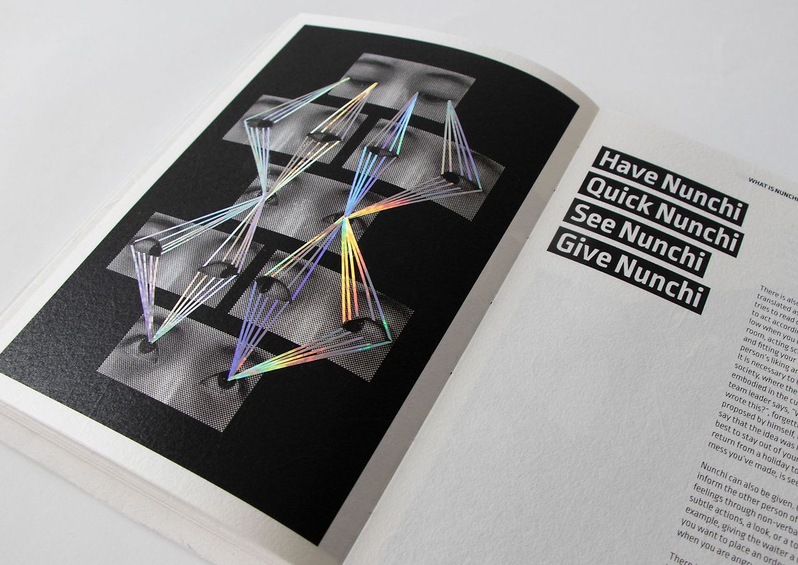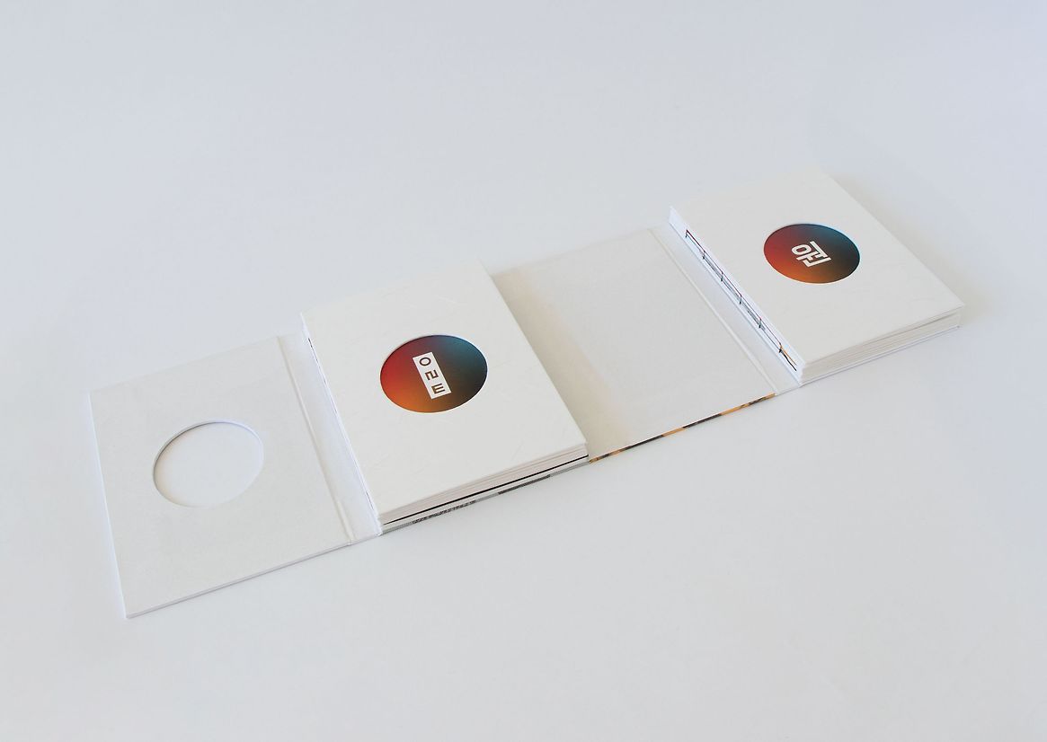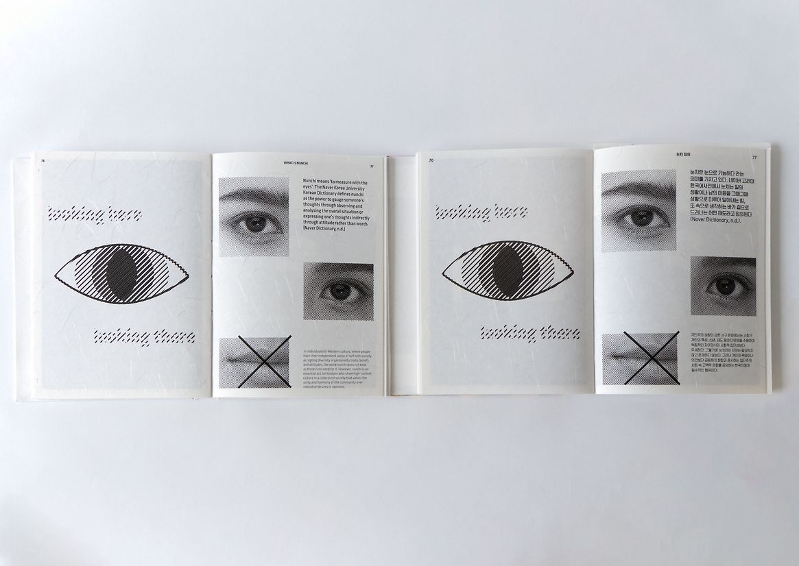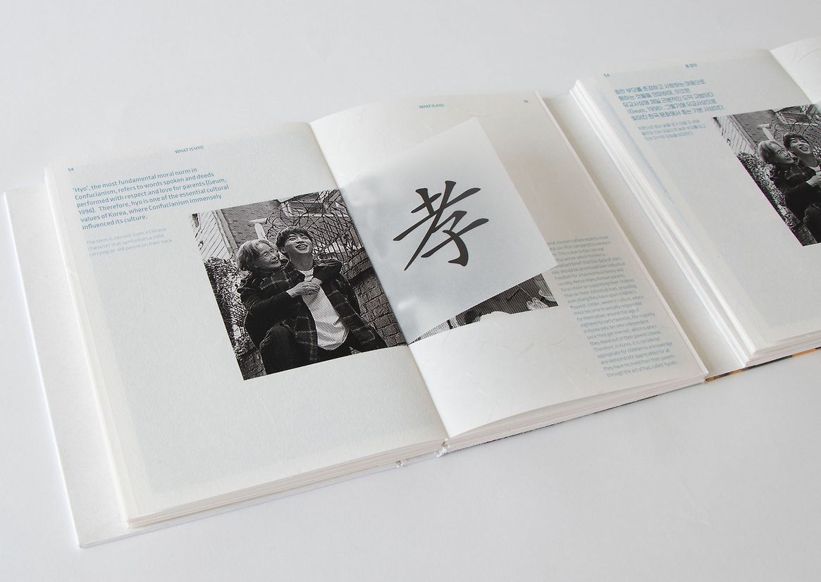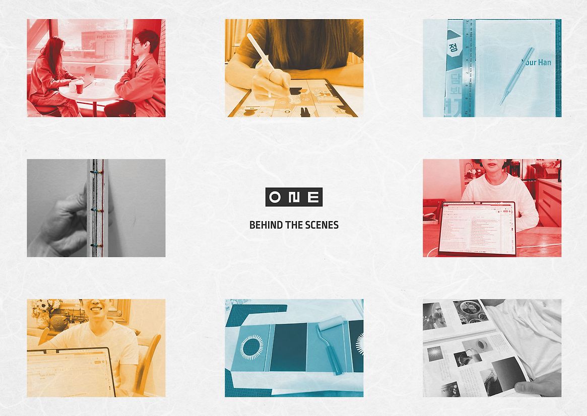 'One', which means ‘desire’ and ‘fundamental essence’ in Korean, aims to support second-generation Korean New Zealander youths to be "one step closer to Korean culture" and their parents. The interactive publication contains narrative about the four words that often get lost in translation as they are directly related to the history and development of Korean culture. The interactive components throughout the publication allow enhanced emotional engagement for the readers to assist with comprehending what they may find unrelated to their life in New Zealand. Furthermore, the visual identity and the use of 'hanji', a traditional Korean paper, embody a sense of 'new-tro' by implementing vintage halftone photography treatment with modern typography; combining a traditional material with the modern method of digital printing. This depicts generational and cultural differences and how they could achieve harmony through an understanding of one another. Consisting of both an English and a Korean version, the reader can read the books side by side to explore more Korean terms or detach them from their cover to share with parents or friends.