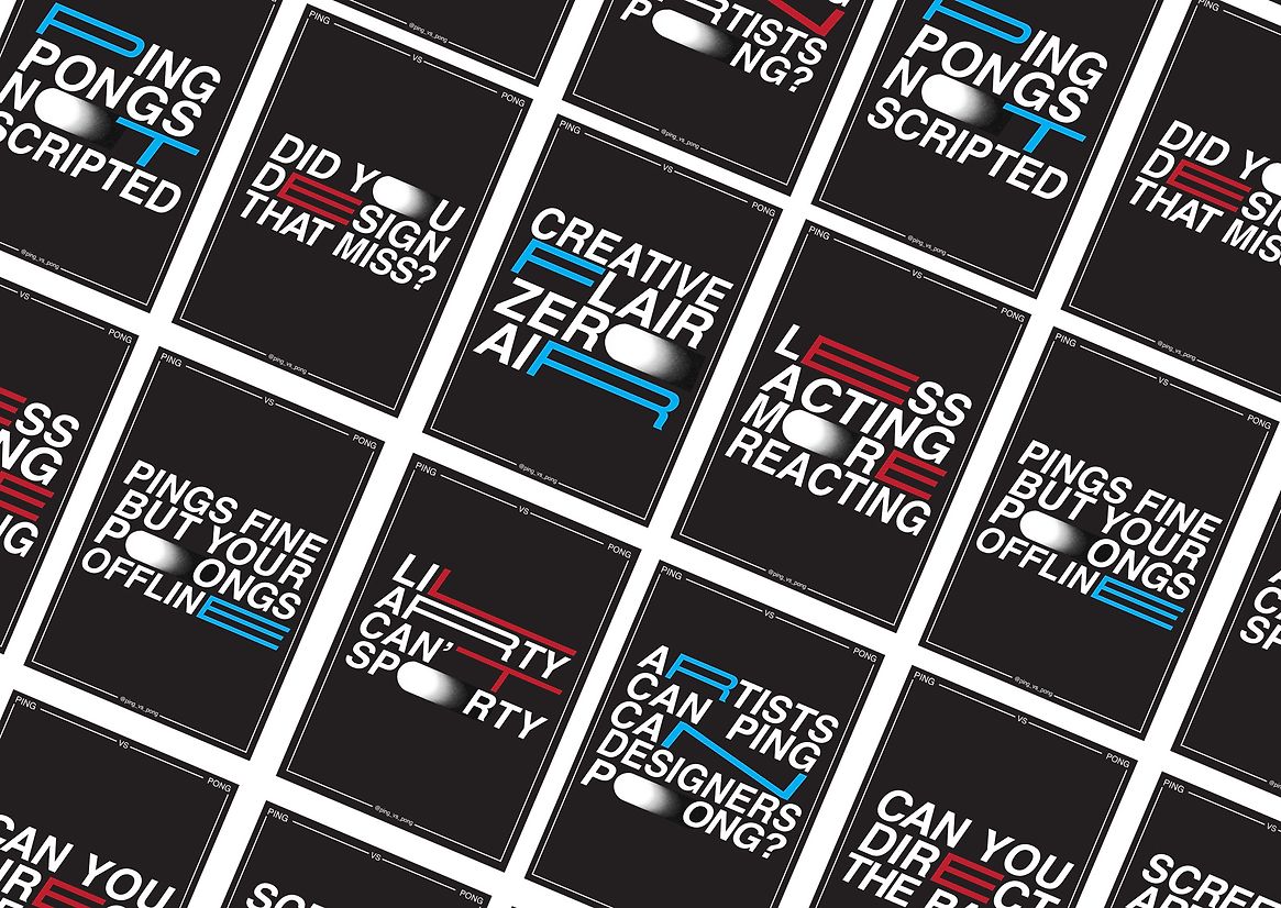 Using a constrained palette, we reimagined the look of ping pong with a bold, modern edge. Graphic patterns on the tables creates a sense of motion, while red and blue accents reinforce the oppositional relationships across the various degrees at the Creative Faculty. The visual emblem represents a flying ping pong ball, tying the visual system together. Custom player bibs and rumour-inducing typographic posters added both humour and drama, turning a league into a spectacle. Every element — from layout to colour to copy — worked together to elevate a simple student event into a sharp, contemporary design experience.