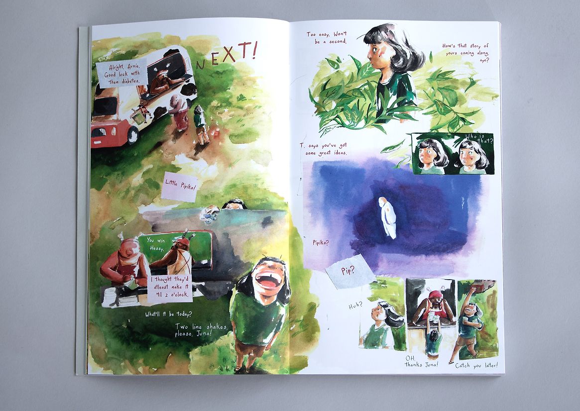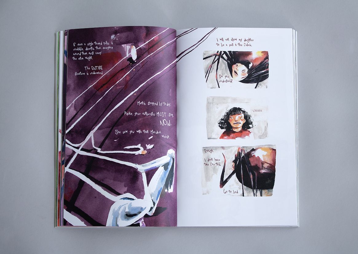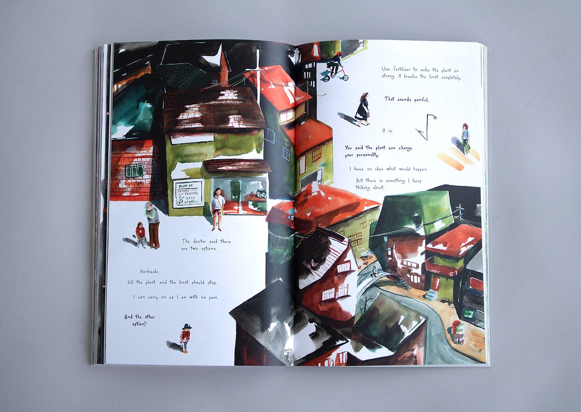 As the story unfolds, we discover that the source of Pip’s wild magic is a plant growing inside her chest. In an effort to contain it, her body has begun to wrap it tightly in threads. In the end she needs to make a choice – to let the plant grow wild and be her authentic self or cut it at the root so she might blend in with the rest.