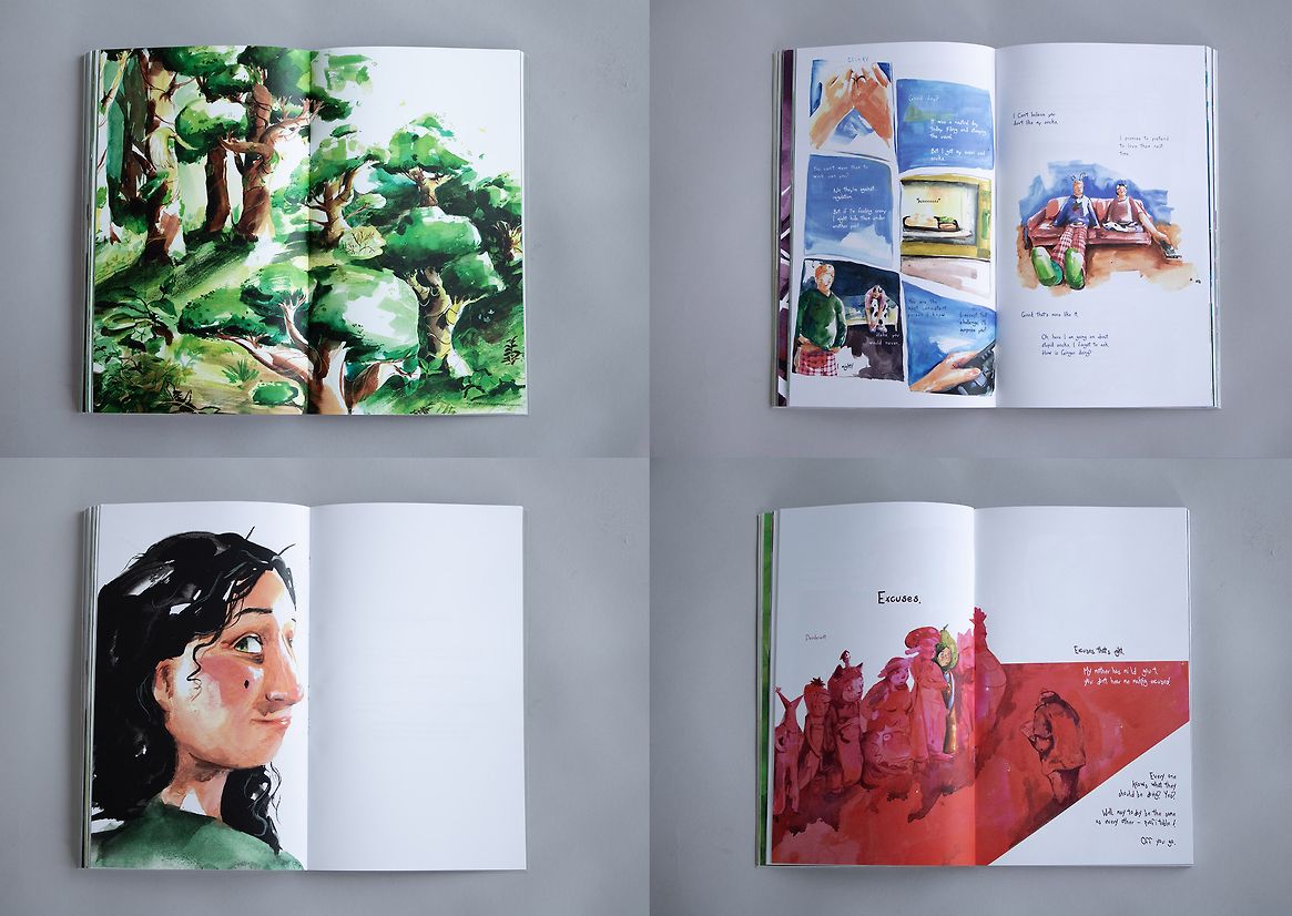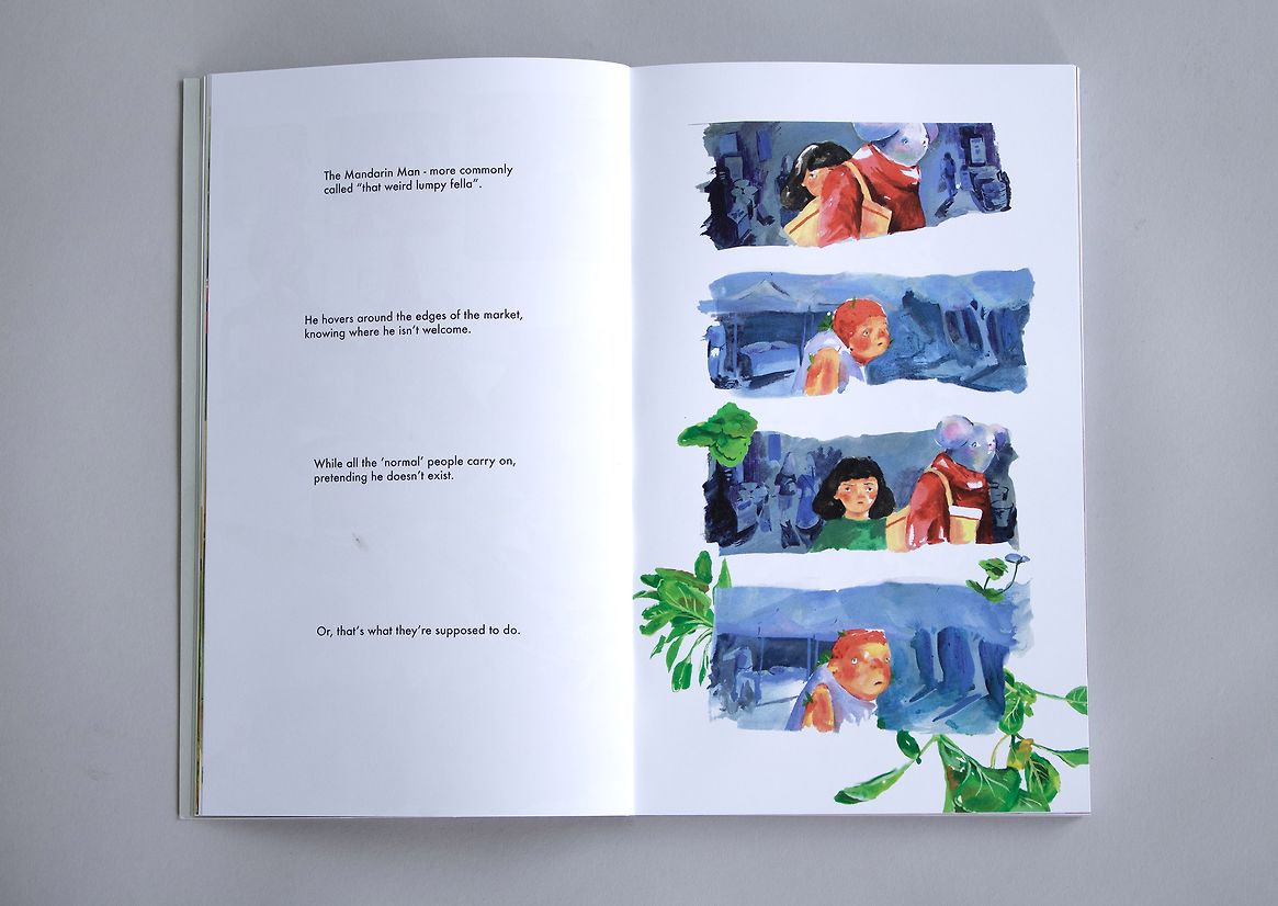 The story is set in an invented reality with anthropomorphic animal and insect characters and bizarre social practices. The final publication uses themes of the bizarre and unconventional to create a reading experience where the audience can suspend their expectations of what could happen in the story, push their imagination to accept unusual realities and see themselves in the story rather than simply watch it unfold as a passive bystander.