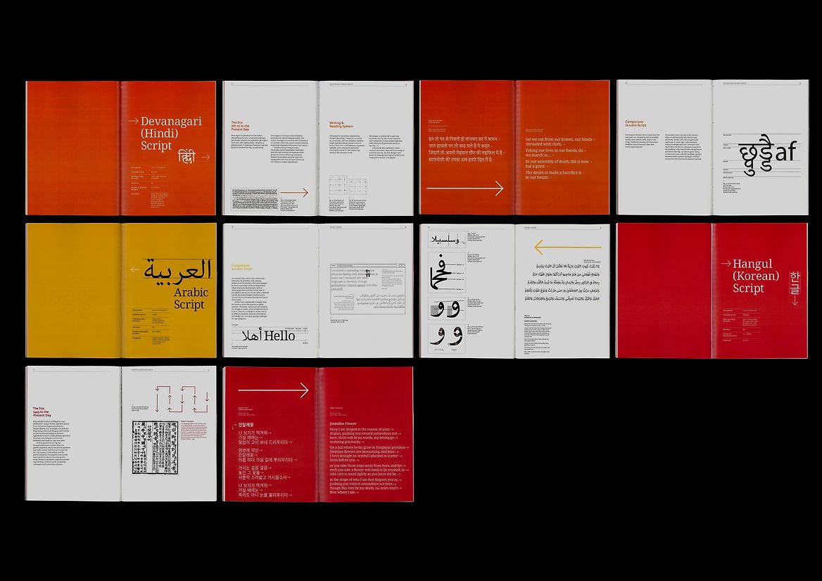 This project invites the intended audience—designers and typographers—on a journey to understand and appreciate various scripts within a typographic setting. Each language’s directionality is deeply rooted in its cultural and traditional calligraphy practices. The goal is to educate and delight the reader while encouraging them to explore the beauty of different languages in typography, understand their application, and learn their unique reading patterns and how they can incorporate these diverse practices into their design work.