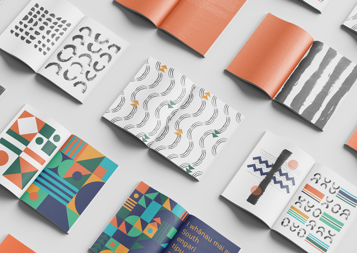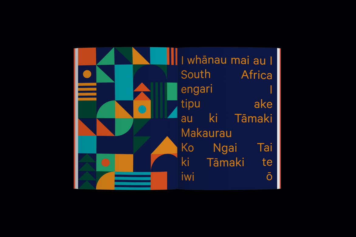 Further conventions of graphic design were considered to further the ideas explored and reflected within the publication; such as type choices (exploring shape in words), colour use (reflected in the Whenua from each country) and paper stock choices (each one selected to enhance its particular media).