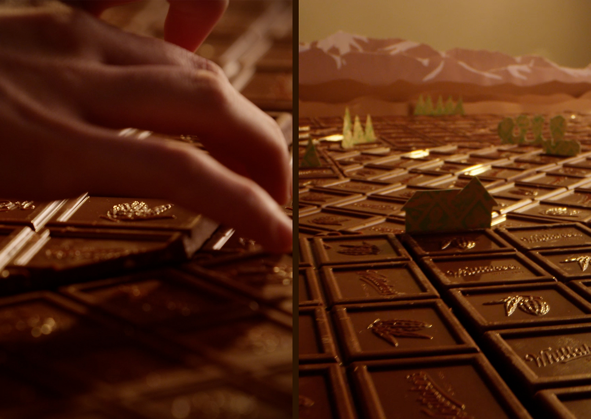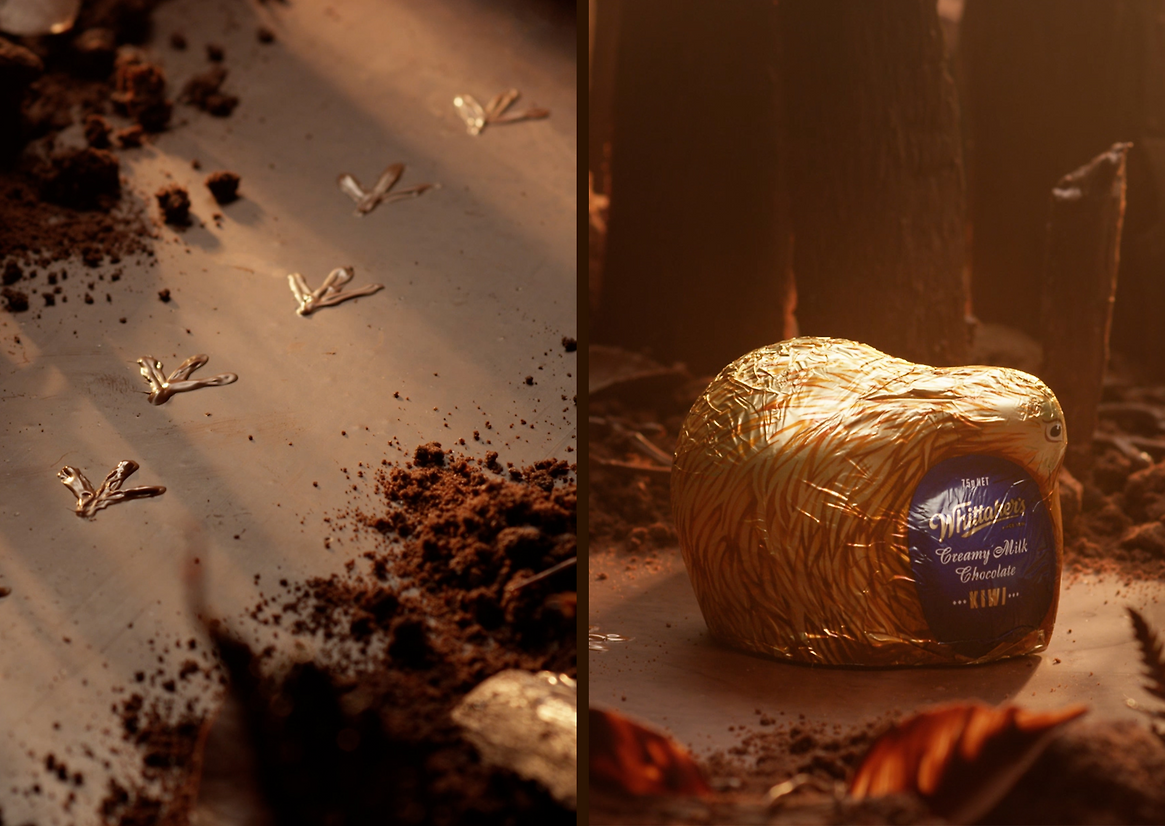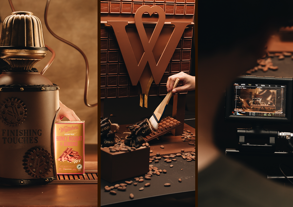 The focus on creating worlds through the finest Whittaker’s chocolate is always at the heart of each film. From Artisan Squares glued with melted chocolate to create backdrops, walls and tiling, to 5 Roll Refined Creamy Milk Sante Bars fastened to fabric to create chocolate conveyor belts. 3D printed moulds create more detailed structures, while real tree leaves and ferns are coated in Dark Ghana chocolate to create organic moulds. Homemade pendulums of melted caramelised white chocolate Blondie have been rigged in the studio, while the iconic Whittaker’s gold foil and Creamy Caramel wrapping have been crafted into trees and origami boats. There are no lengths we don’t go to sculpt the story and fulfil the Whittaker's “Best is always better” brand ethos.