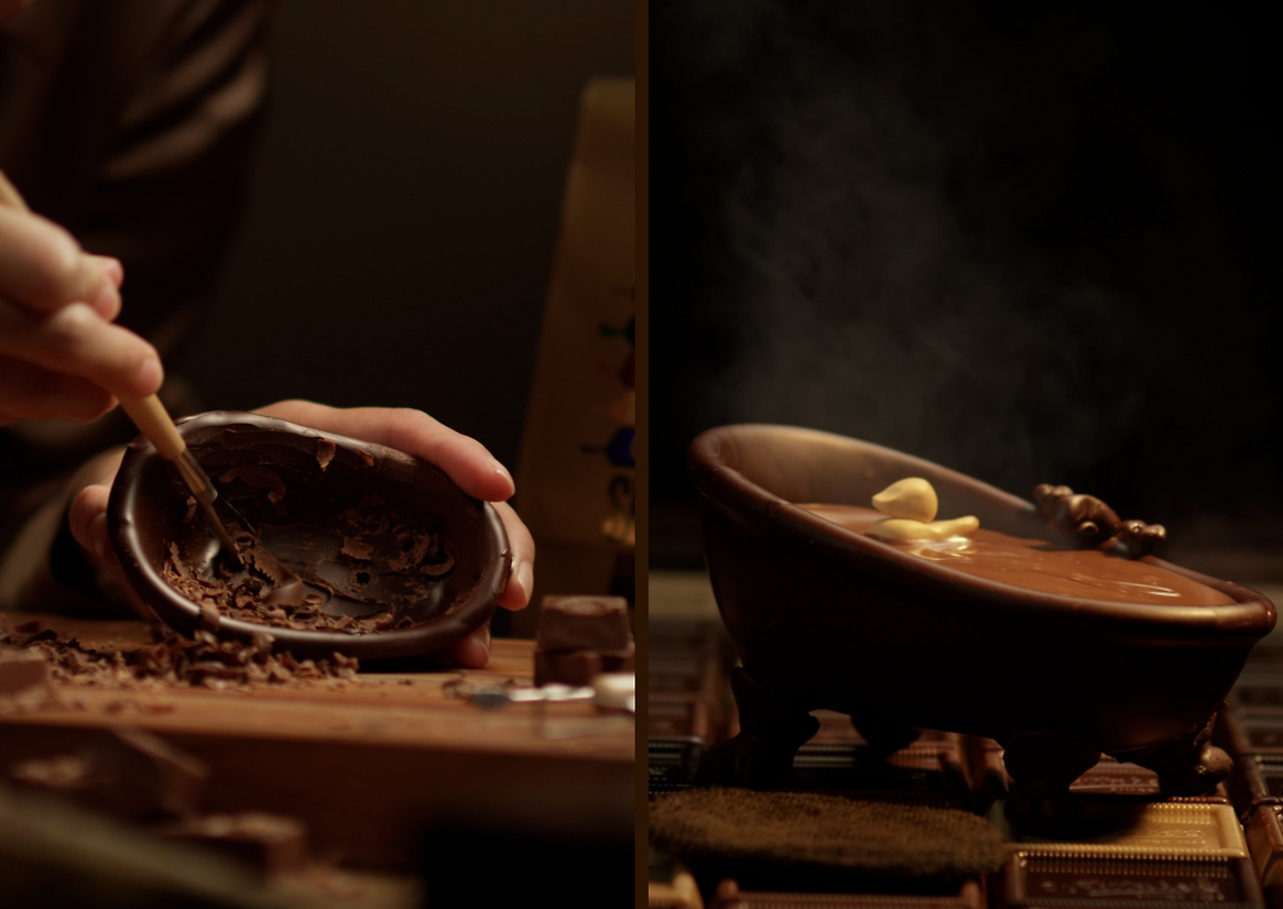 Each piece is filmed to follow a simple story structure – an unknown “maker” moulds, crafts, etches, grates, imprints the chocolate ingredients. This leaves room for the loyal Chocolate Loving audience to guess before the final artisanal masterpiece is revealed.