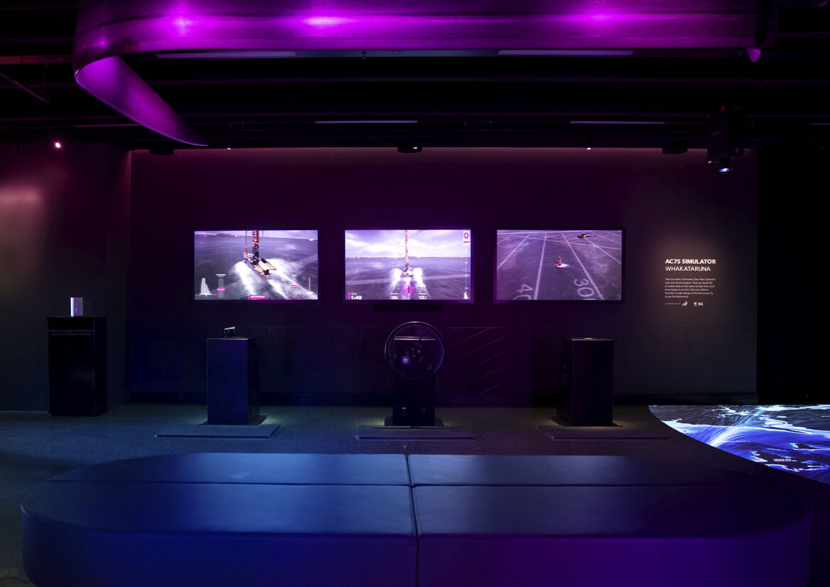 Te Aihe is an immersive 4D flight across the Waitematā aboard an AC75 yacht. The multi-sensory experience incorporates a 13 metre wraparound screen with 360 degree footage rendered onto the semi-circle to make it feel like you’re on the water.