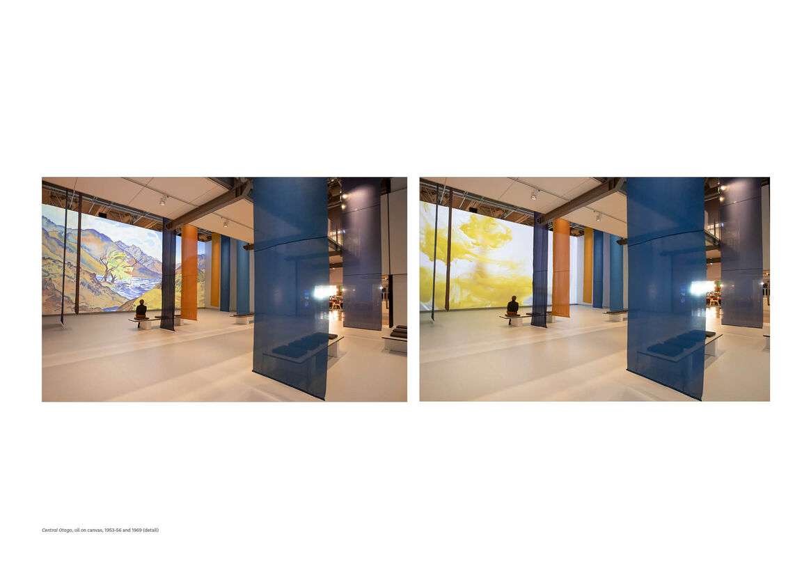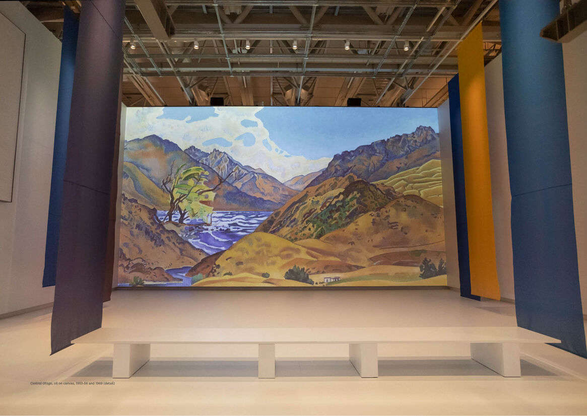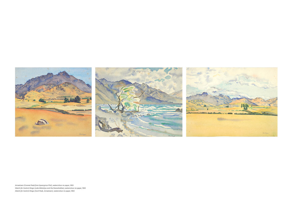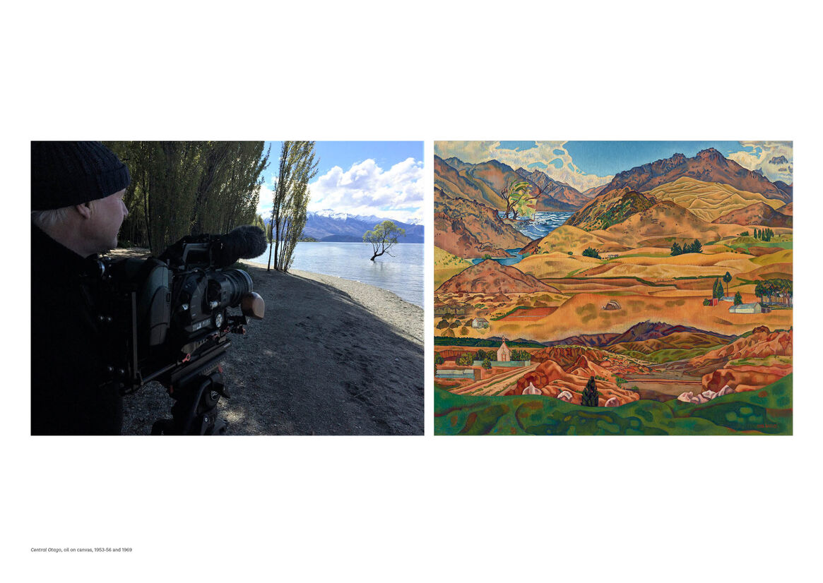 Filming on location captured the movement of light, wind, and weather. Angus recorded features like mountains and trees, but also the feeling of being in a place. She wrote to her friend Douglas Lilburn, who had commissioned the painting: “It’s all there, the strangeness, colour, exhilaration.”