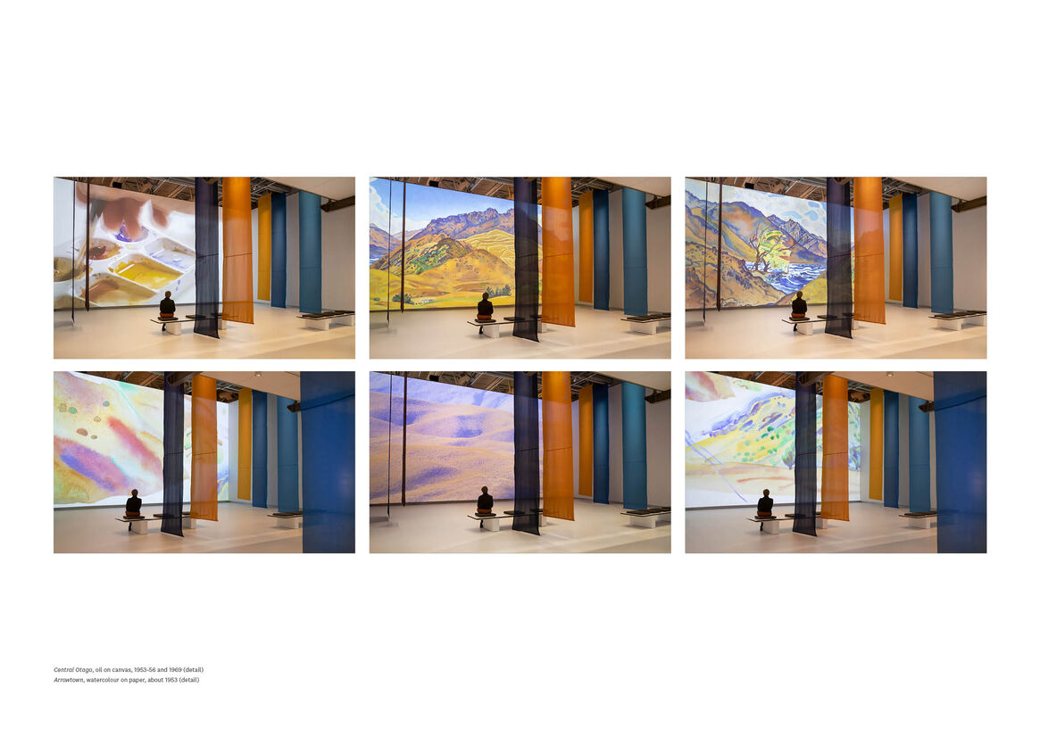 The film takes visitors – at cinematic scale – through the process of looking at, sketching, and painting a landscape. Atmospheric scenes shot in Central Otago cut to vivid watercolour studies of the same location. Detailed research by Te Papa’s painting conservators revealed the artist’s technique and colour palette. Scenes shot with a macro lens bring Angus’ method of watercolour painting to life.