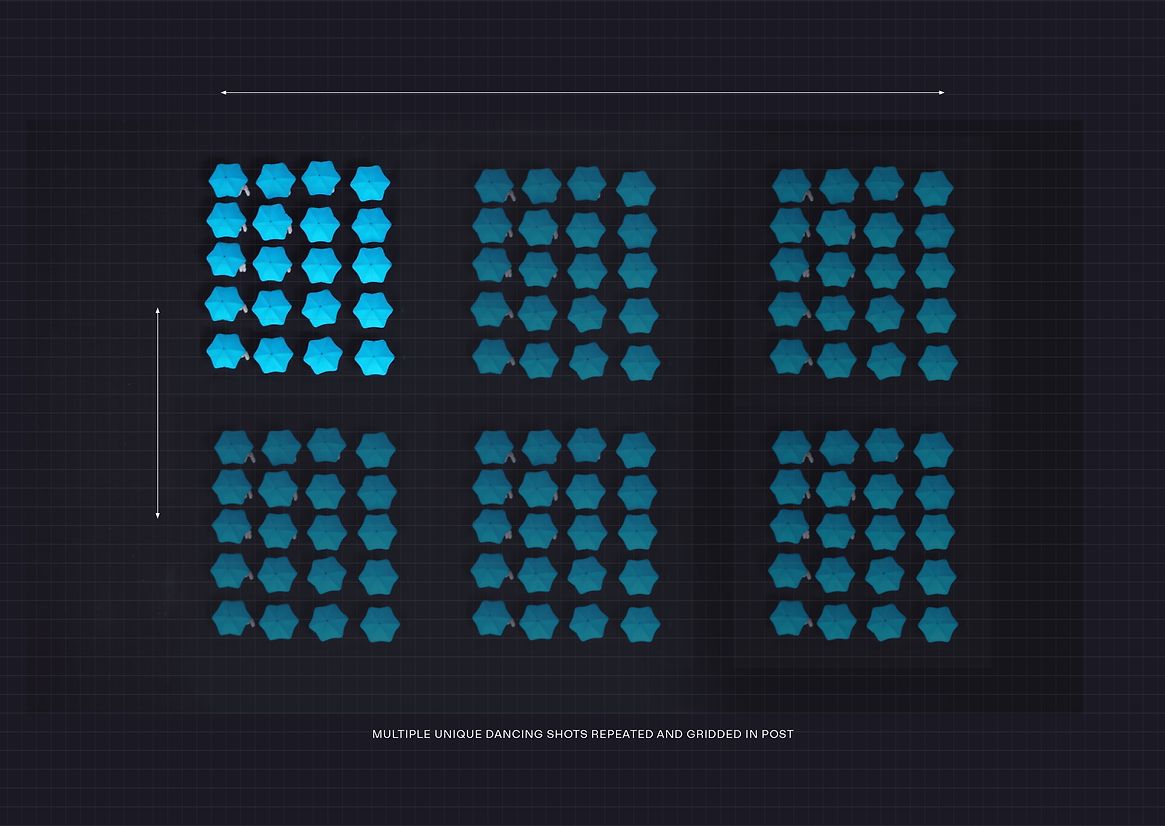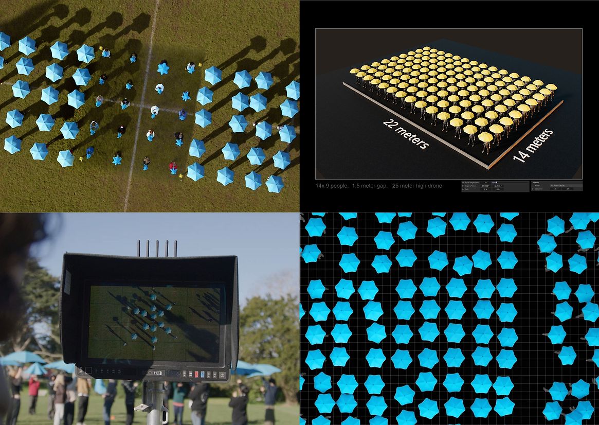The DJI Inspire 3 drone made it technically possible to multiply our number of performers in post; transforming 20 dancers into 180. Simple umbrella actions were manipulated in detail, creating a finale of live action animation depicting weather symbols.