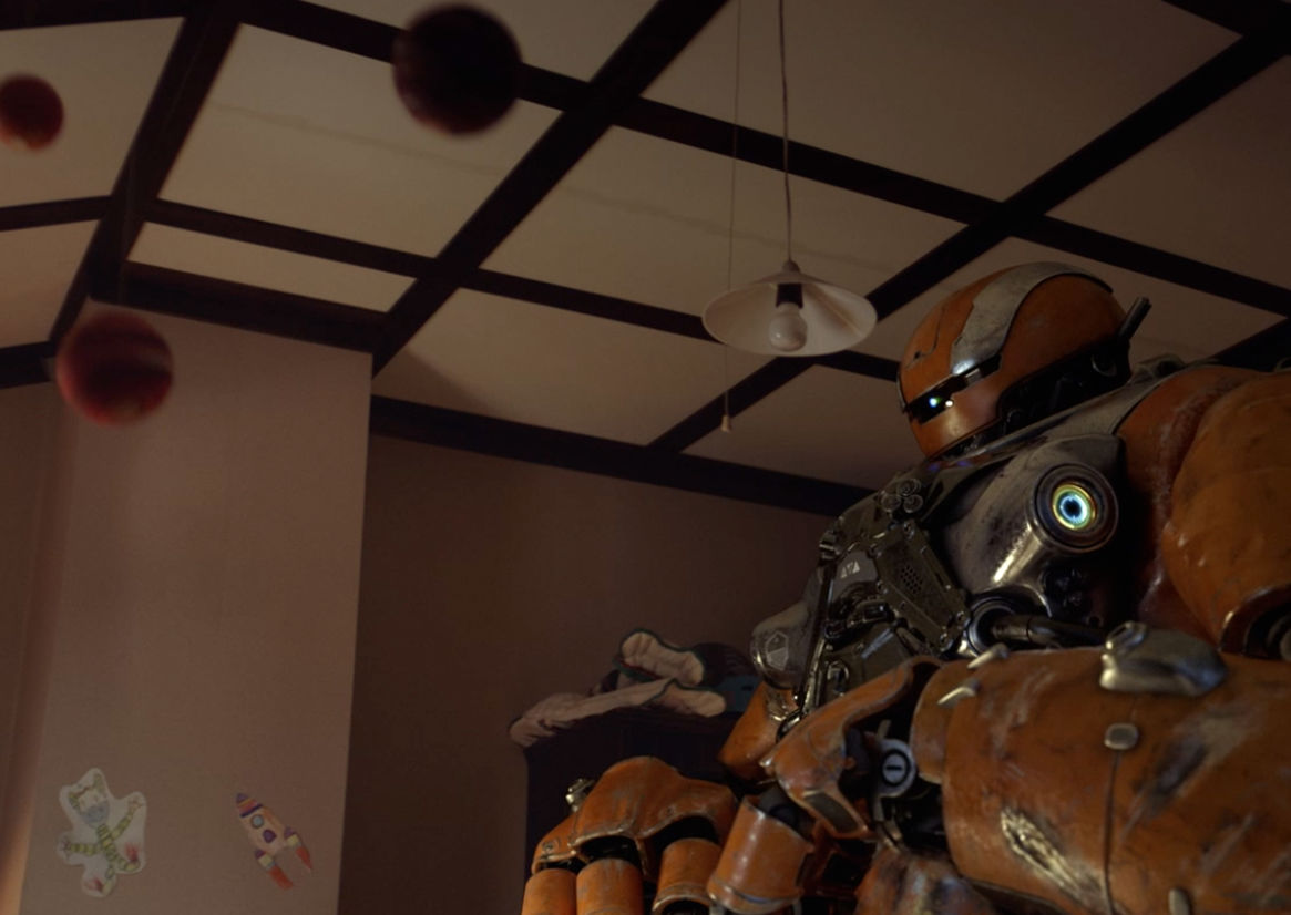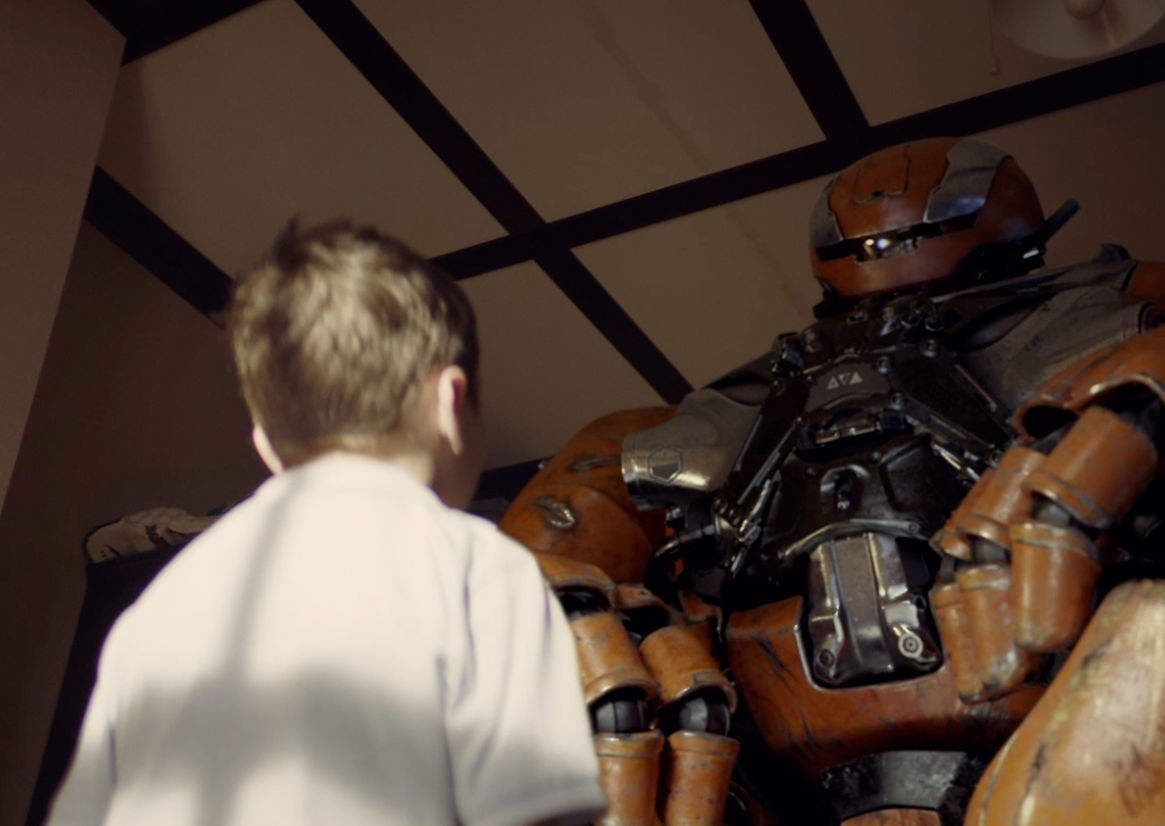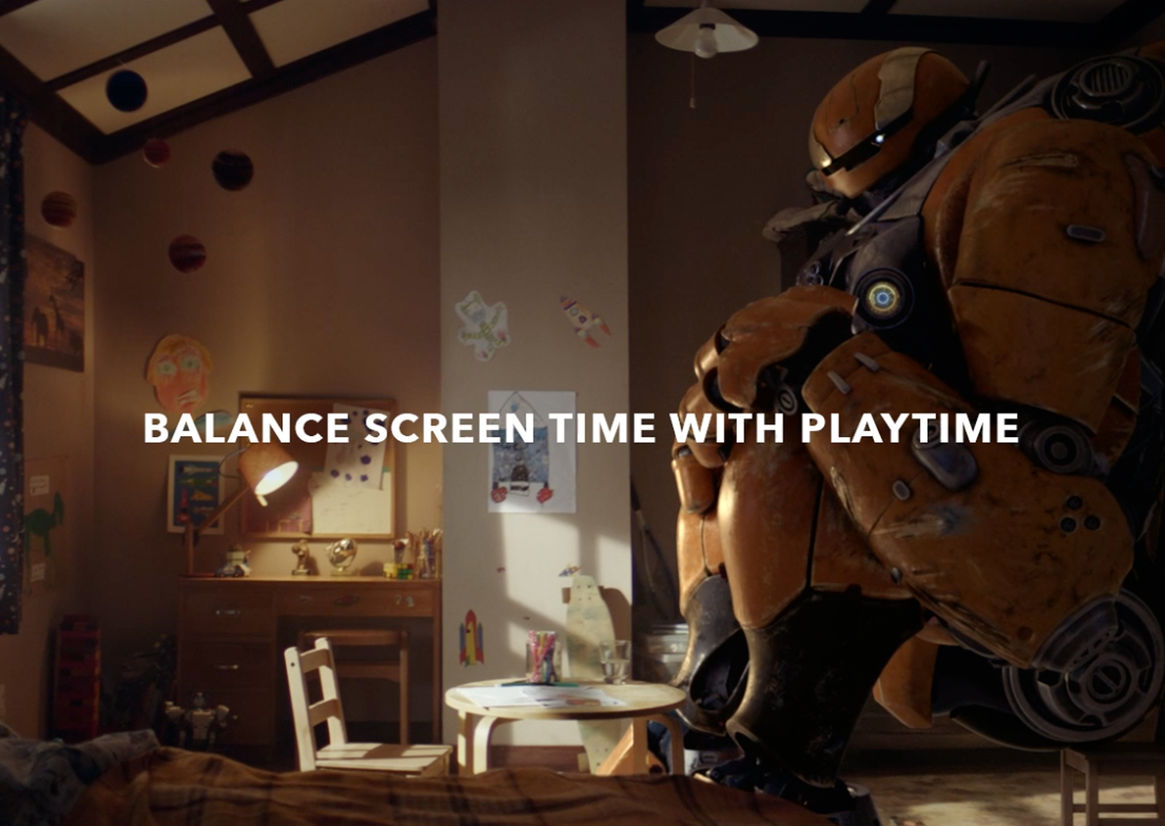 In our film, 7-year-old Toby sits down to have a grown-up conversation with his favourite computer game character. The family have been discussing his screen time usage, and as a result, Toby stands up to his 12ft intergalactic battle robot by suggesting they spend some time apart in order to get a bit of balance. He exits the room with Play by Spark, a smart rugby ball Spark has been developing that helps families balance screen time and playtime.