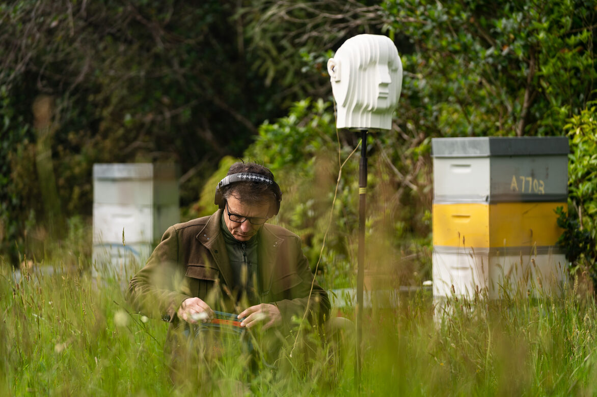 This original music uses bees as musical instruments, with the beehives on the Makino land recorded binaurally using a wooden dummy head as well as the solo bees recorded by following them with a boom microphone.