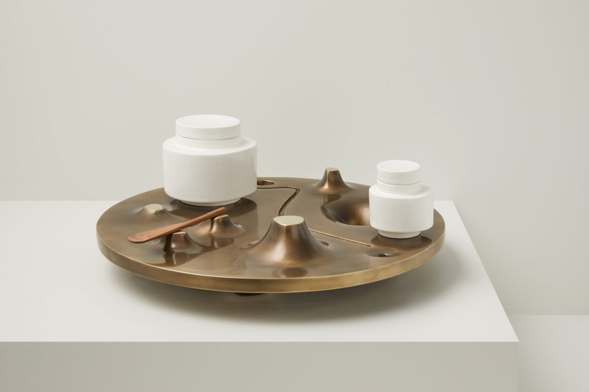 The brass sculpture depicts the topography of the land, guarded by majestic mountains and holds ceramic pots forged from its clay and filled with premium Manuka honey.