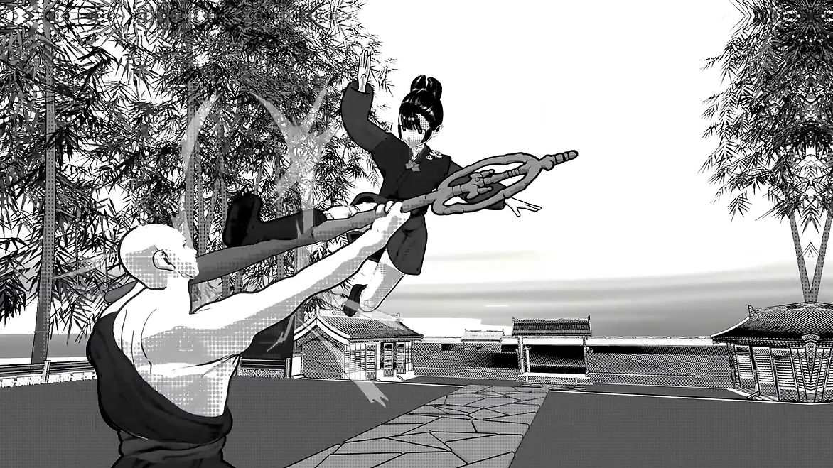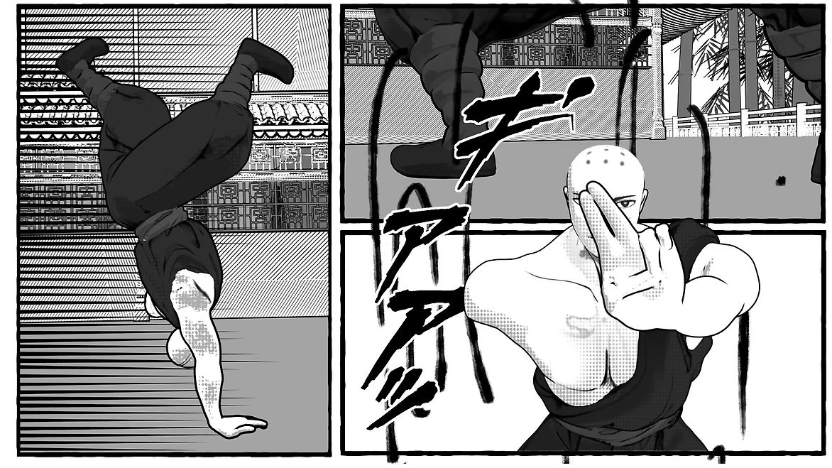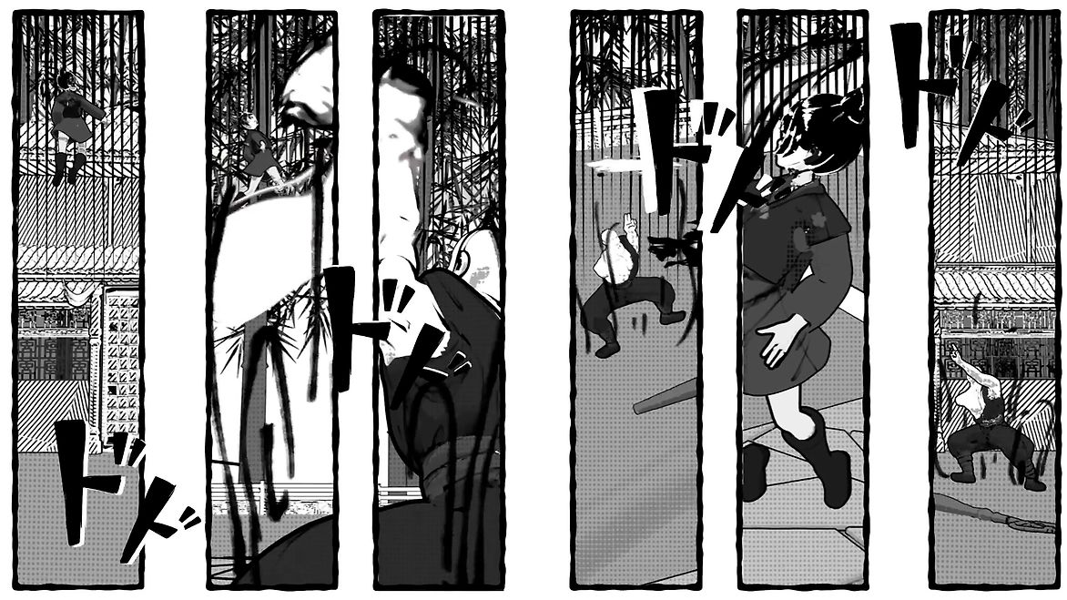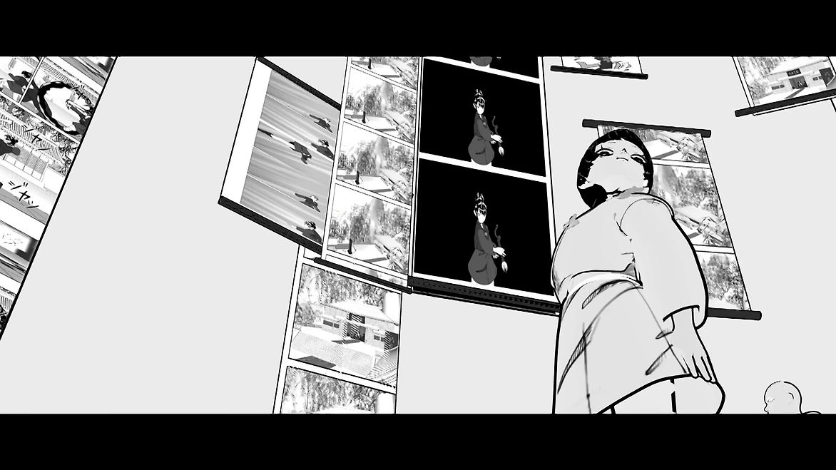 This short animated film aims to combine the cinematic form and art style of manga to showcase a 2.5D comic book world, bringing the audience a fresh experience of ‘watching’ a manga. My interests are in creating the texture of hatching and screentone, for a martial arts sequence (animation). There are two types of animation in the short film: martial arts-style actions and combat are 3D animation; manga elements (such as speed lines, smears and onomatopoeia) are made in 2D. The film tells the story of a female thief that steals an artefact in a temple, but is prevented by a guardian which leads to fierce fighting. This conflict causes the world around them to collapse, revealing to them they are characters within a manga.