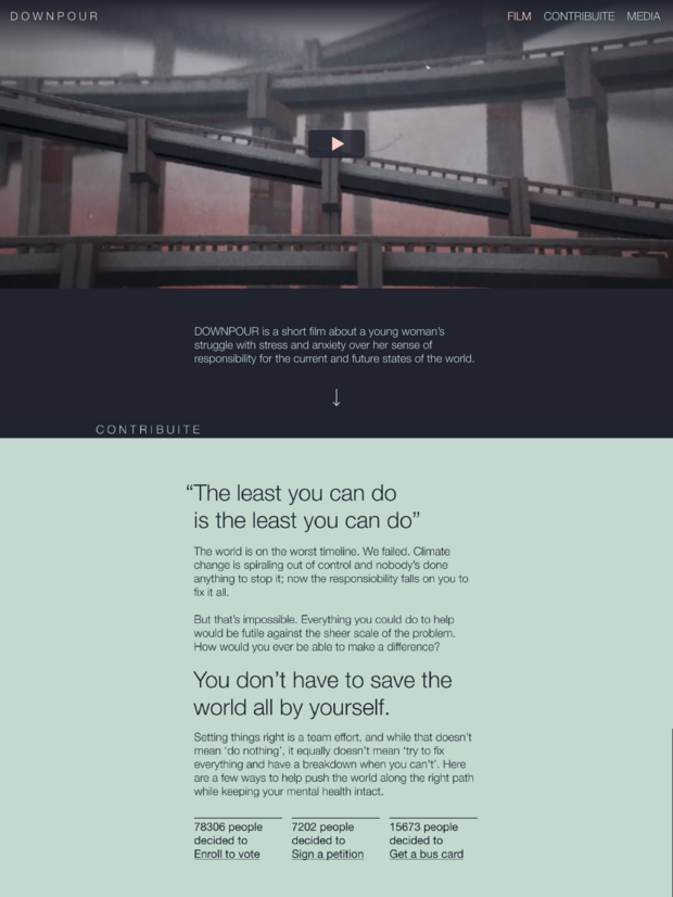 A young woman struggles with the weight of climate change affecting her day to day life at every turn and decision. How will she make it through this crisis? Will she overcome her cycle of inaction or will she sink further into apathy and despair? Downpour seeks to explain and help facilitate empathy with climate anxiety and how that affects someone's agency in making conscious decisions towards climate change even at the mundane level.