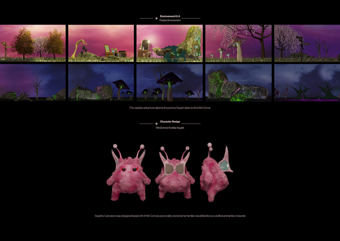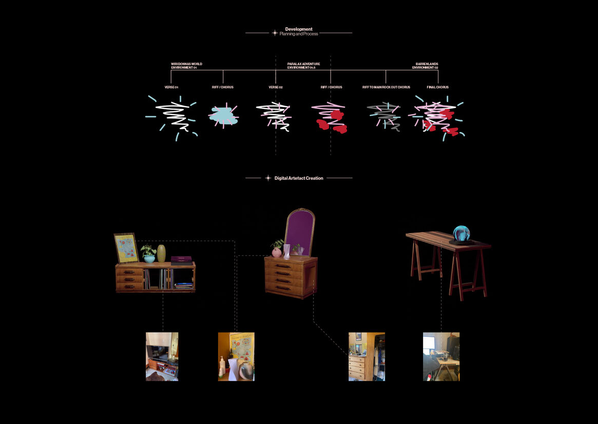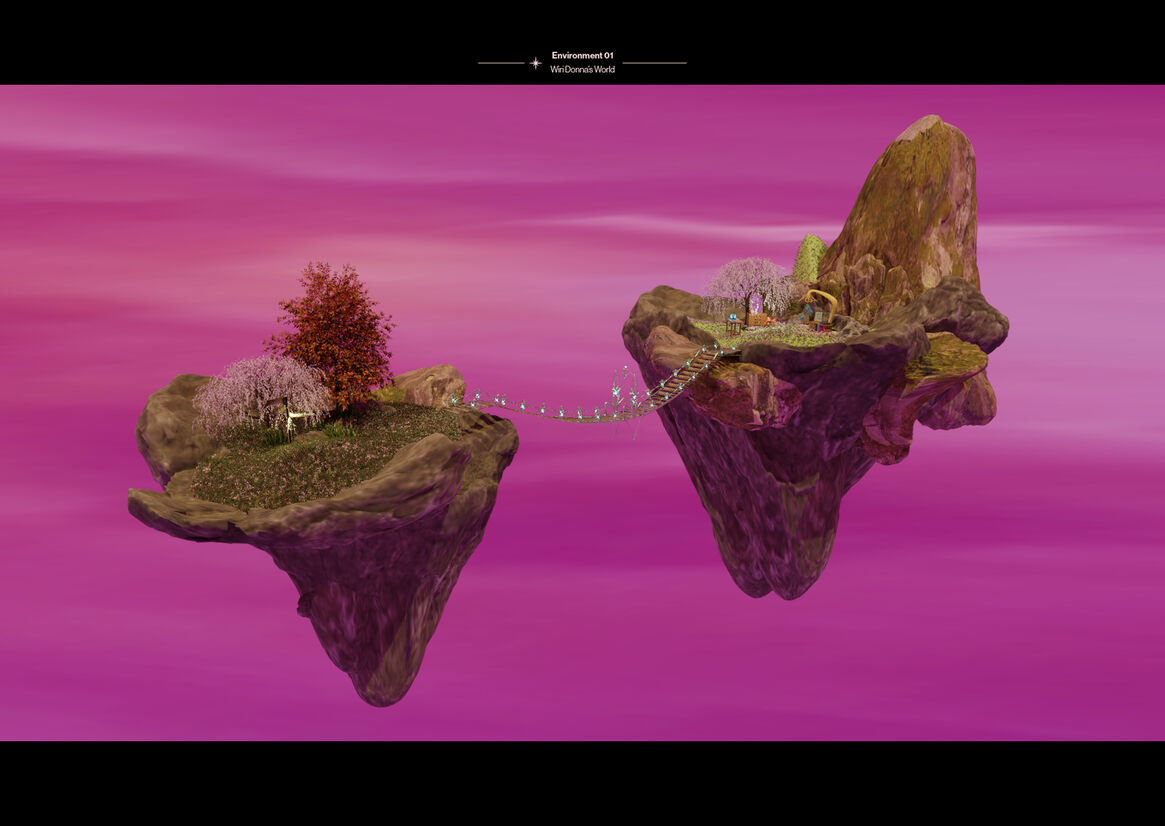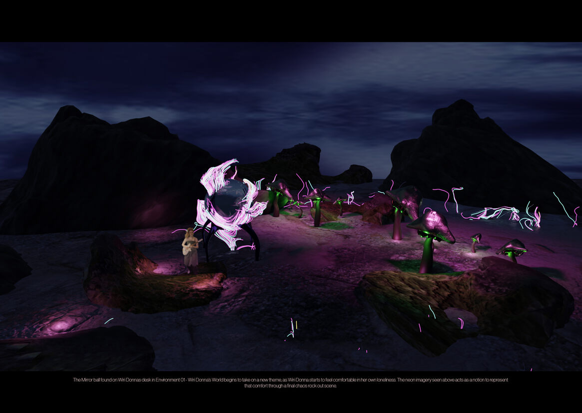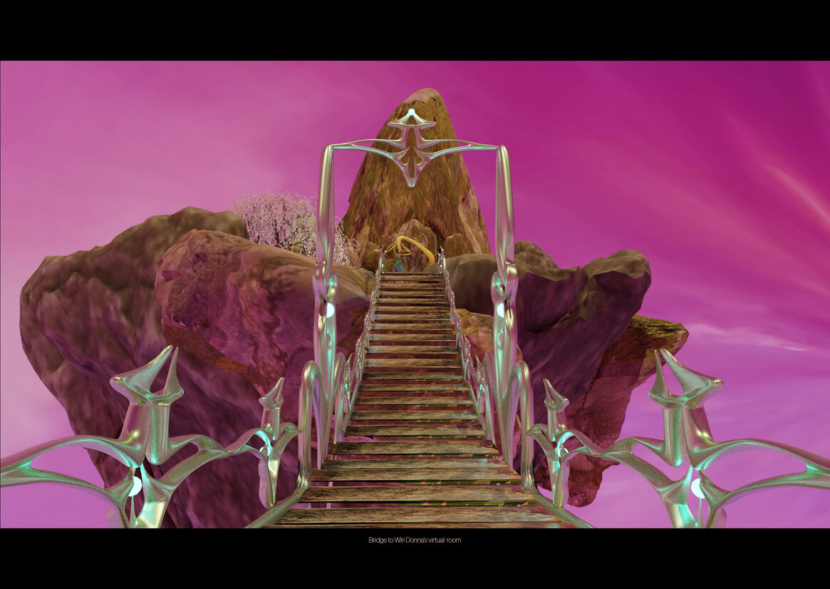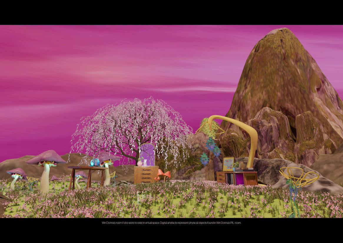 The theory behind the virtual magic explores the notions of binary parameters applied in a way that personifies and exponentially expresses one's freeness in virtual space; thus, Wiri Donna's freeness is expressed within her own virtual landscape. Transportation by bubbles, empathy and connection by caricature, site by theme and time by feeling. The addition of physical artefacts, such as the contents of Wiri Donna's IRL room, provides a grounding attachment to the things we hold close, and inherently express ourselves with, in the physical world. These objects and environments are abstracted in a way that allows viewers to engage with a non-binary lens of experiential space ambiguously.
