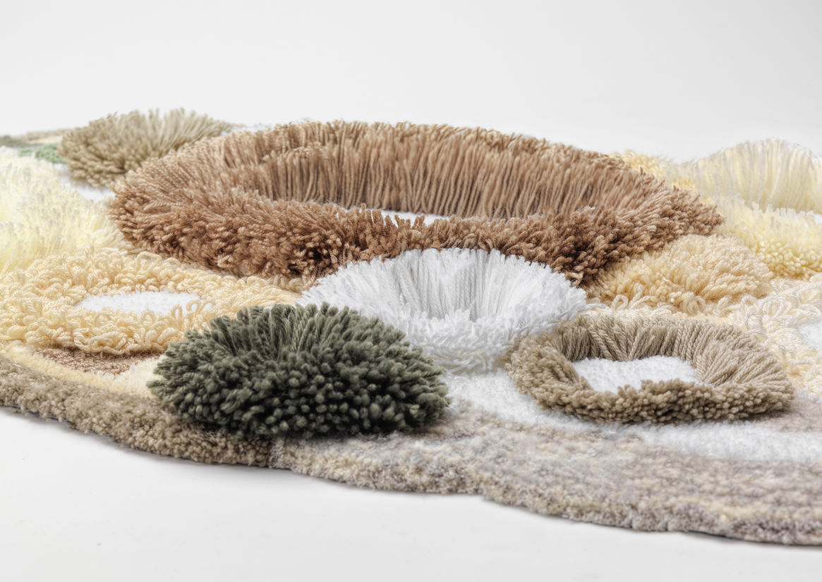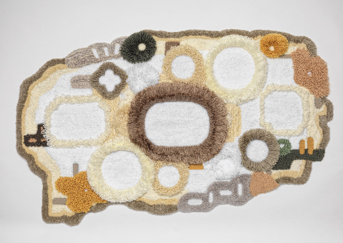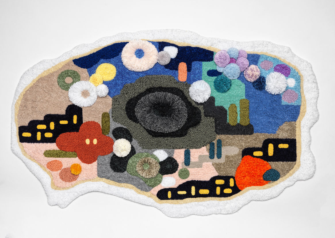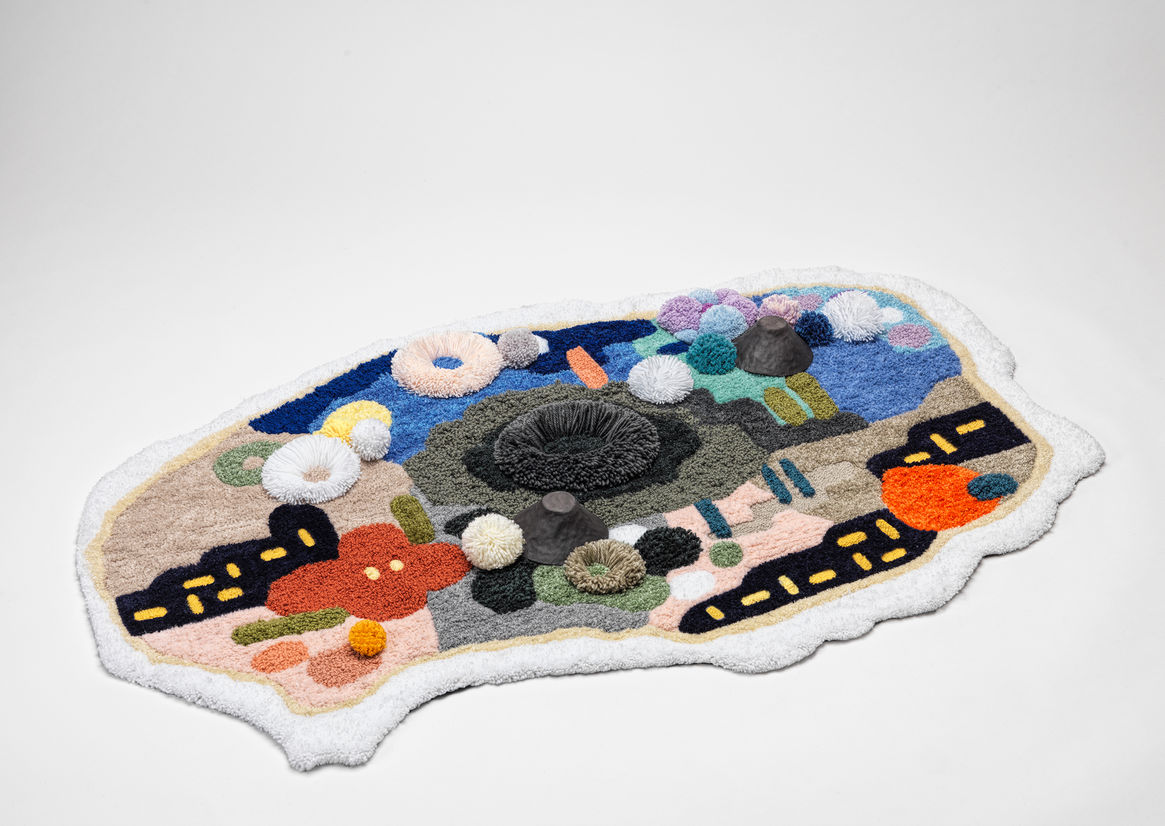 As people follow the abstract images in the rug, people can also notice the real place of my mother's and my memories. Starting with Mt. Halla in Jeju Island in the centre of the rug, there are mediums that can remind me of the past, such as camellias, canola flowers, and hydrangeas. The locations of all parts of the island share memories of my mother and I and are made based on real locations, and each rug is made according to the colour of our memories.
