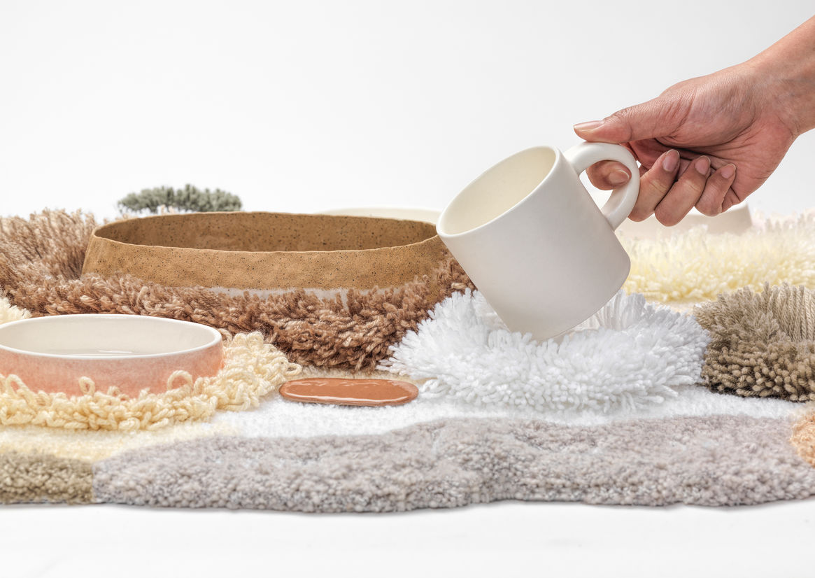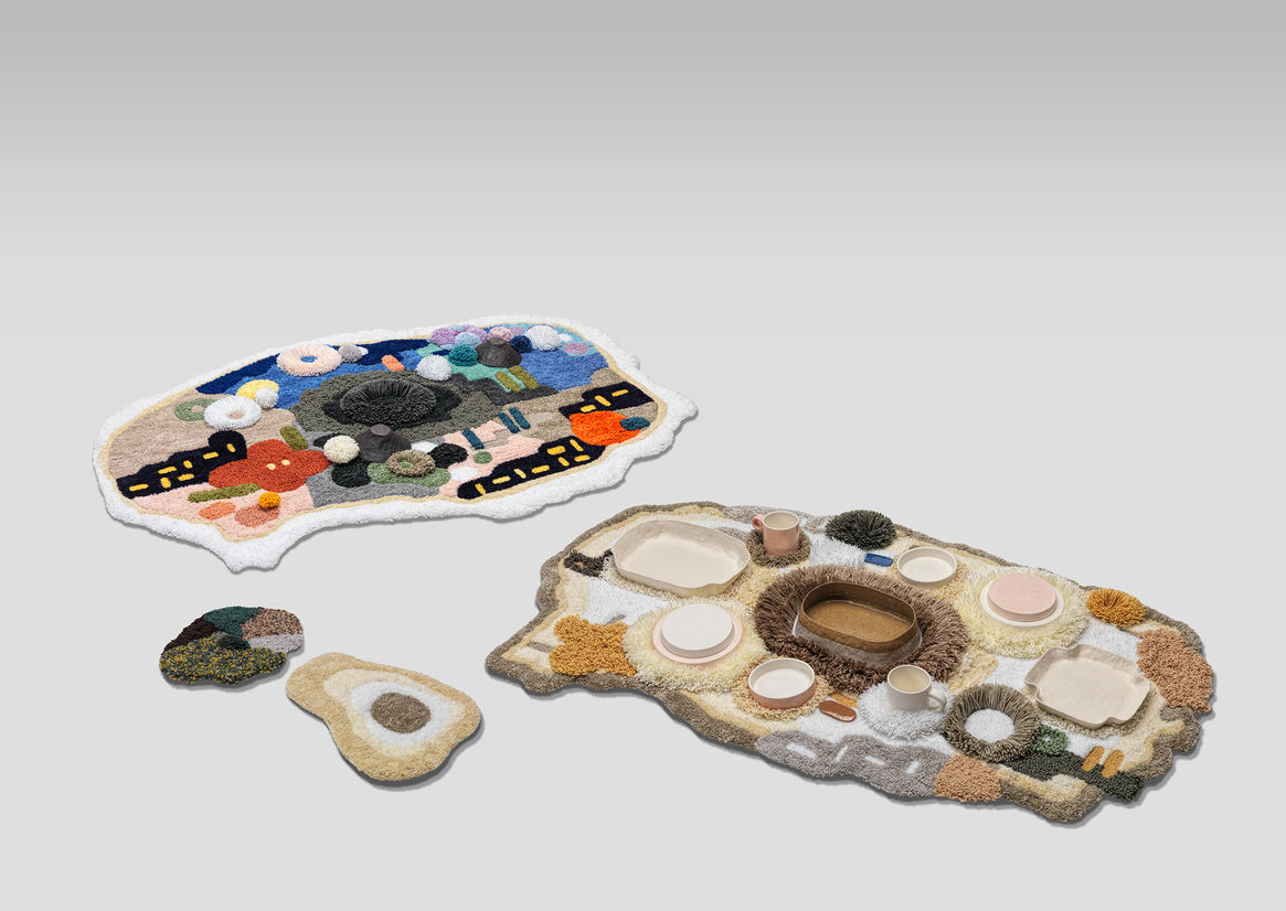 To me, Jeju Island is more than just a place to go on a family outing; its landscape, colours, and forms contain our travels. As people follow the abstract images in the rug, people can also notice the real place of my mother's and my memories. Starting with Mt. Halla in Jeju Island in the centre of the rug, there are mediums that can remind me of the past, such as camellias, canola flowers, and hydrangeas. The locations of all parts of the island share memories of my mother and I and are made based on real locations, and each rug is made according to the colour of our memories. These ceramics were meant to show that the memories are shared and come together. It was made to achieve harmony even in the colour of ceramics. The vivid pink from my mother's colour palette and the cream colour from my colour palette blend together to create a pale pink. These bowls are designed to be used on both sides. In particular, the inside and outside colours are different is to show the harmony of each other's memories.