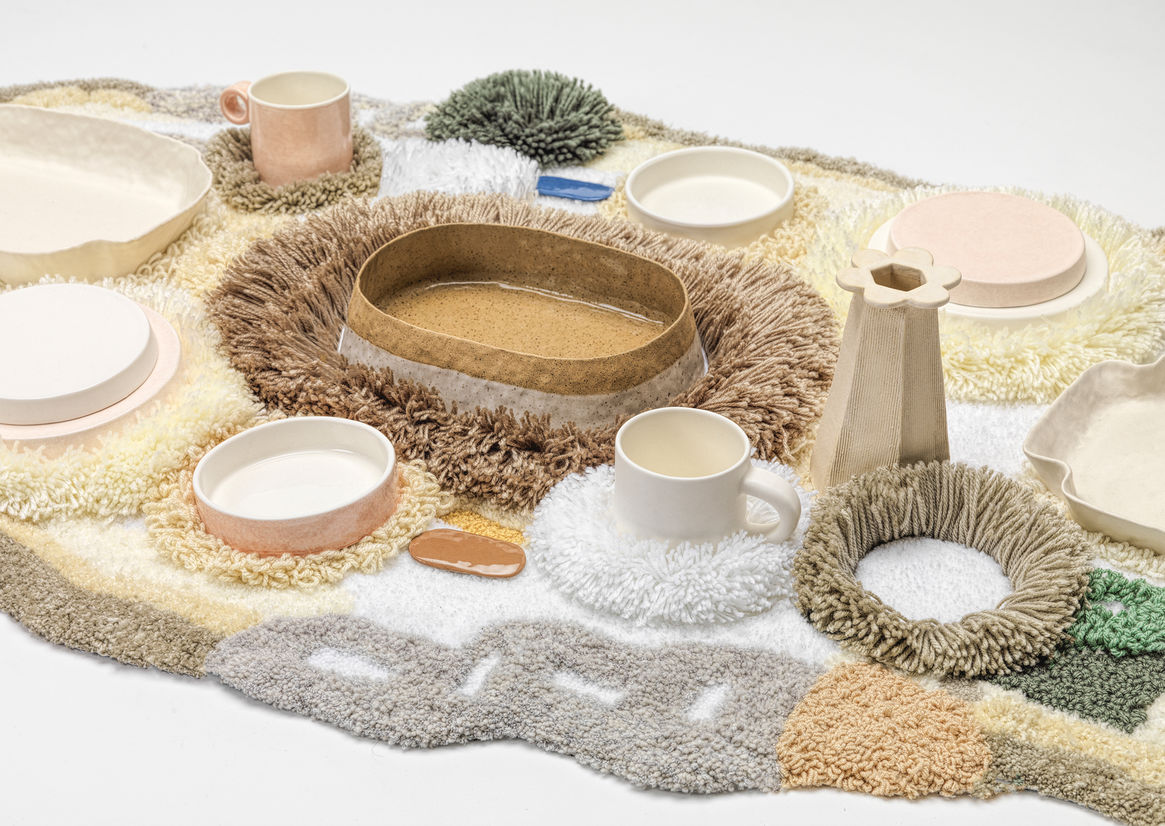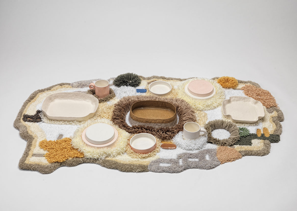 I have striven to activate memories through touch to keep them close at hand, creating tactile objects that celebrate and recollect the colours and textures of significant places. The travels I took with my family when I was young became the inspiration for this research. Reconstructing these journeys, I explored haptic design and created evocative colour palettes to represent the passage of time. Inspired by Jeju Island's colours, shapes, and textures, I have explored the relationship between geographic and emotional topography. Combining ceramics and textiles to craft experiences that evoke the land as a site for memory. I have used ceramic and textile production methods to create a picnic-like experience that reimagines the past as a tactile feast, bringing those distant close.