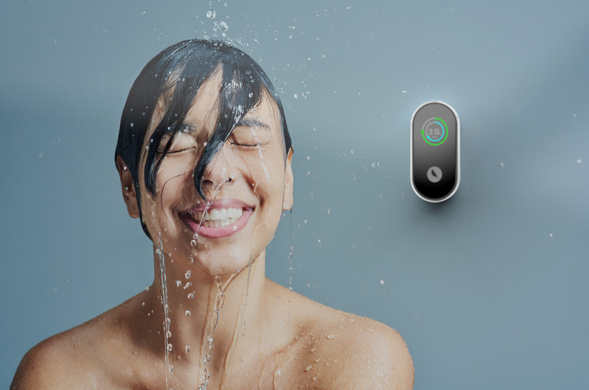 The compact sensor attaches to any showerhead or pipe without the need for intrusive installation methods. The device monitors the water usage using measuring sensors and sends the information in real-time to the hub. The hub then displays the information on a time/usage timer.