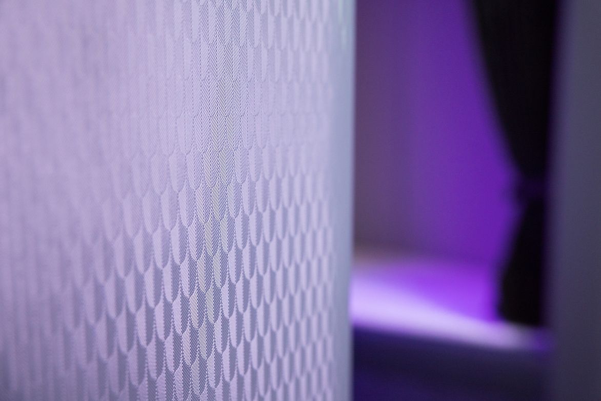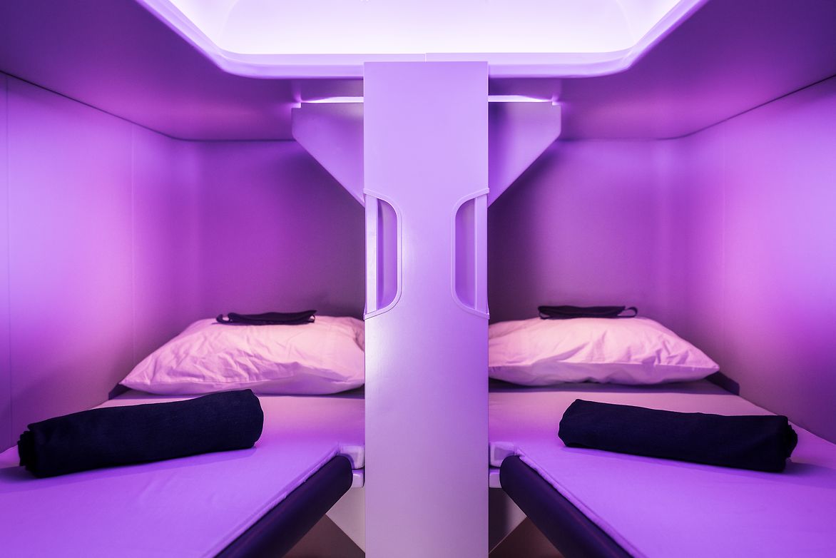 Features such as the stairwell (as opposed to a ladder), the sculpted dome height (to ease access to the top bunk and enhance the sense of space), positions of the handgrabs (for safety and ergonomics), the internal angled entryway (for privacy from the cabin), and side-on access to each bunk (as opposed to end-on access) were all informed by our engagement with customer groups and observations of their interaction with several iterations of full-scale prototypes. These considered details make the zone feel familiar and comfortable to passengers.
