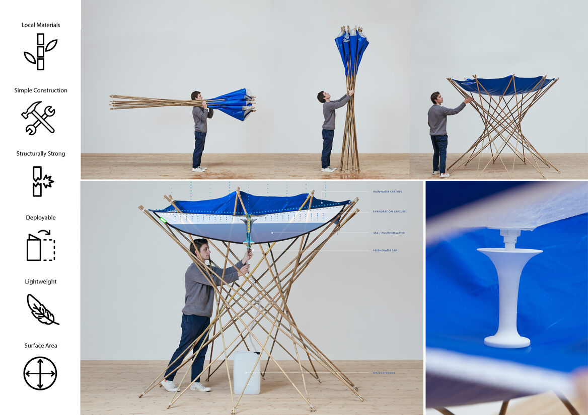 The Portable Solar Distiller was designed with adaptability and accessibility at its heart. The low tech and autonomous solution, utilises the power of the natural environment by harnessing sunlight to distil polluted and sea water, while also providing a rainwater capture system.