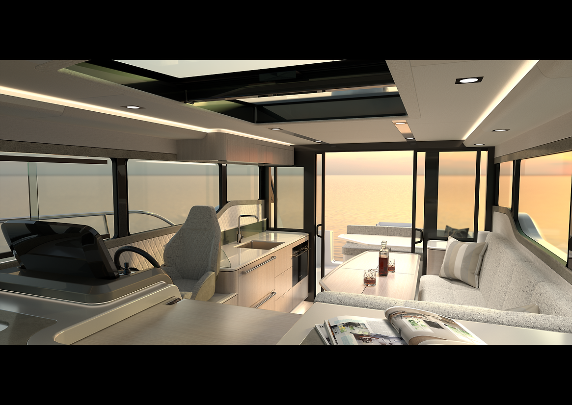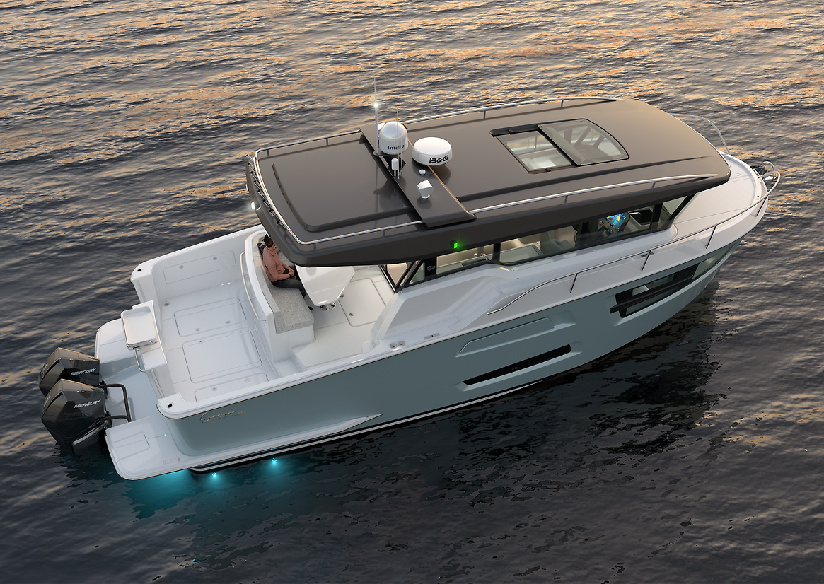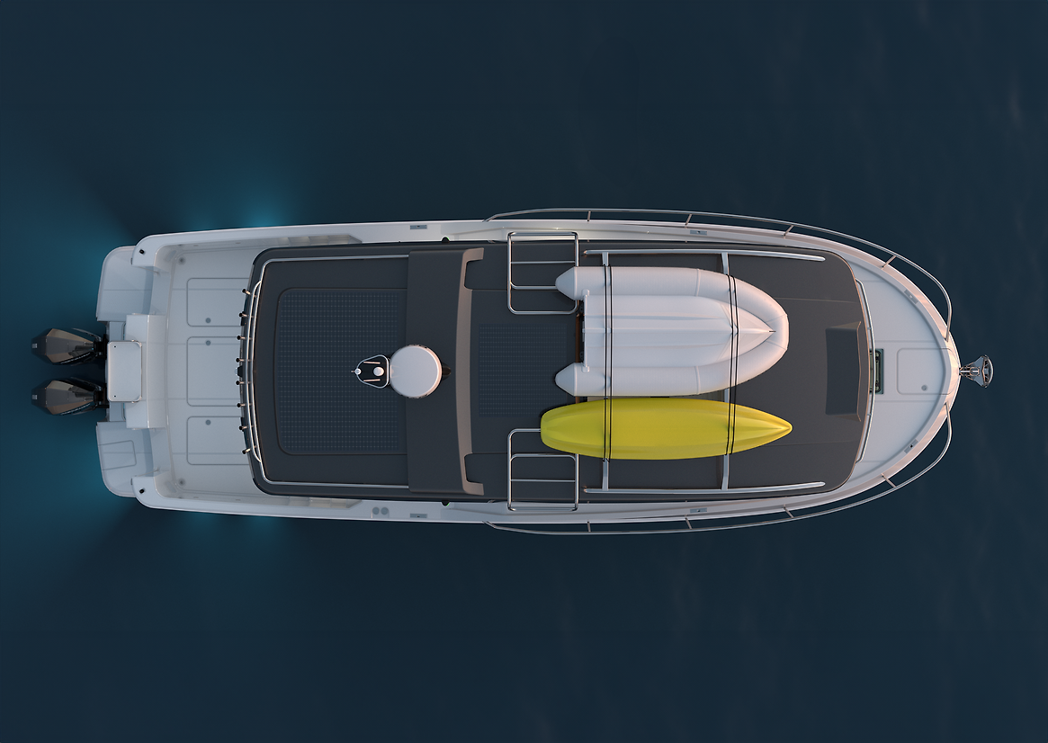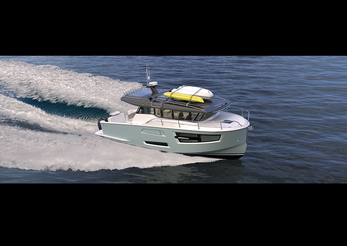 The exterior styling features modern design elements, characterized by sleek, chiseled lines and expansive windows providing 360 degree views. A large skylight with opening sunroof brings in plenty of natural light and lets the outdoors in. The reverse windscreen enhances the sense of spaciousness in the main saloon, ensuring excellent visibility, minimizing solar heat gain, and reducing reflections during nighttime operations. Below the waterline, the hull's fine entry and double chine design maximize volume in the forward accommodation and helps keep the boat dry in choppy conditions. Powering options also bring flexibility offering a simple and uncomplicated twin outboard installation or a single inboard.