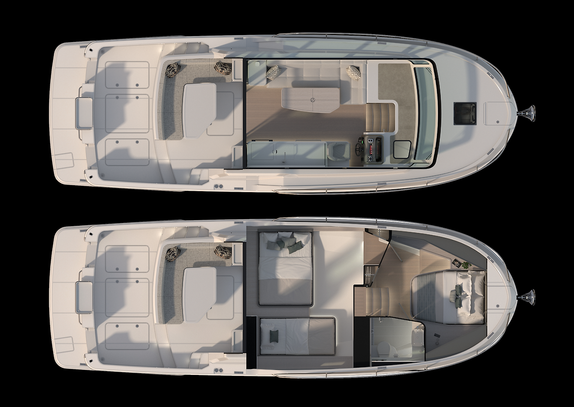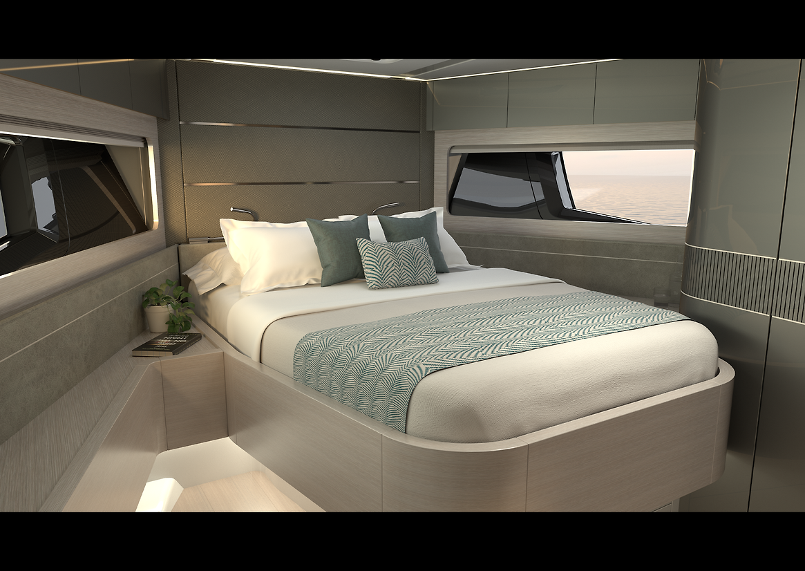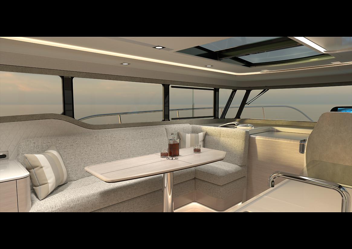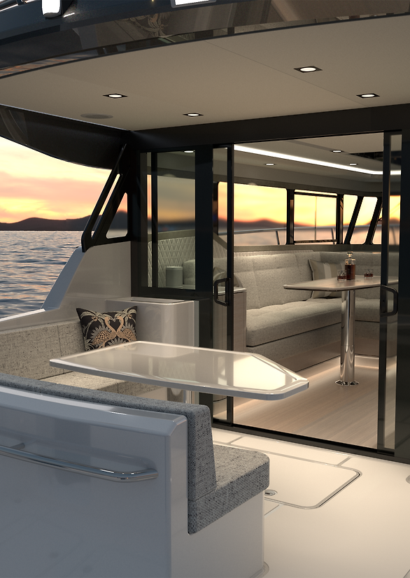 The exterior styling features modern design elements, characterized by sleek, chiseled lines and expansive windows providing 360 degree views. A large skylight with opening sunroof brings in plenty of natural light and lets the outdoors in. The reverse windscreen enhances the sense of spaciousness in the main saloon, ensuring excellent visibility, minimizing solar heat gain, and reducing reflections during nighttime operations. Below the waterline, the hull's fine entry and double chine design maximize volume in the forward accommodation and helps keep the boat dry in choppy conditions. Powering options also bring flexibility offering a simple and uncomplicated twin outboard installation or a single inboard.