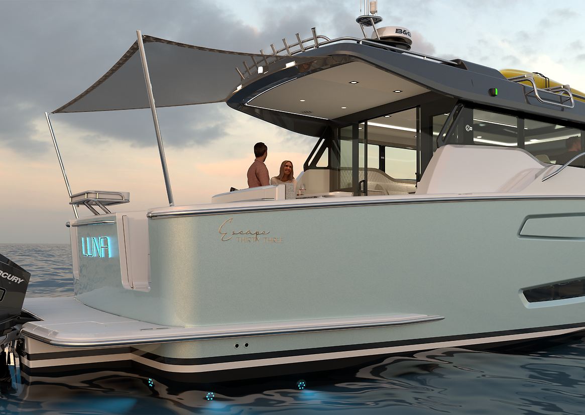 The Kit Carlier Design ‘Escape 33’ is a 33-foot (36-foot overall) monohull SUV power cruiser, designed to fill a gap in the Australasian market. Options for similar vessels are very limited, often extremely expensive, larger and more complicated than our target audience are seeking. Imports are unsuited to Australasian conditions and lifestyle, with lack of sun protection and insufficient outdoor space to cater to the indoor-outdoor living that is sought. The Escape 33 is a versatile, affordable, and efficient vessel poised to revolutionize the Australasian market.