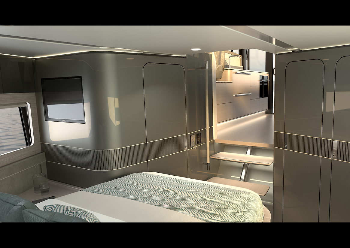 The Kit Carlier Design ‘Escape 33’ is a 33-foot (36-foot overall) monohull SUV power cruiser, designed to fill a gap in the Australasian market. Options for similar vessels are very limited, often extremely expensive, larger and more complicated than our target audience are seeking. Imports are unsuited to Australasian conditions and lifestyle, with lack of sun protection and insufficient outdoor space to cater to the indoor-outdoor living that is sought. The Escape 33 is a versatile, affordable, and efficient vessel poised to revolutionize the Australasian market. Our client research identified an exciting opportunity to deliver a well-appointed vessel that is attainable for a typical middle-class Australasian family. From this research, a concise list of objectives was developed: a stable, easily driven hull shape that maximises accommodation and performs well at sea; a versatile solution able to suit a vast array of buyers and their activities such as diving, fishing, and exploring the coastline; and an affordable yet luxurious interior fit-out that prioritises weight savings to achieve maximum efficiencies. Designing the exterior was a careful balancing act. We created a sea-kindly platform, prioritising maximum efficiency while conveying a go-anywhere, do-anything attitude. Simultaneously, we aimed to maximize interior volume to create a high-end, comfortable space with multiple zones suitable to accommodate a small family. As a result, the Escape 33 is an optimized luxury craft with every millimeter of space thoughtfully utilized. The exterior styling features modern design elements, characterized by sleek, chiseled lines and expansive windows providing 360 degree views. A large skylight with opening sunroof brings in plenty of natural light and lets the outdoors in. The reverse windscreen enhances the sense of spaciousness in the main saloon, ensuring excellent visibility, minimizing solar heat gain, and reducing reflections during nighttime operations. Below the waterline, the hull's fine entry and double chine design maximize volume in the forward accommodation and helps keep the boat dry in choppy conditions. Powering options also bring flexibility offering a simple and uncomplicated twin outboard installation or a single inboard. In the raised cockpit section, a dining space provides shelter from the elements and grandstand seating for observing activities. This versatile area can also be transformed into a daybed for leisurely relaxation under the sun. The spacious lower accommodation includes a generous master cabin with an ensuite and an additional guest cabin, all accessible via floating steps through a sliding companionway door. In the master cabin, a centrally positioned double berth is embraced by plush upholstered panels, creating a serene and luxurious atmosphere. The guest cabin, tucked aft and separated by its own door, offers both a single and double berth to cater to various accommodation needs. The Escape 33 represents a perfect balance of form and function for an easy and enjoyable experience, while maintaining affordability, to be an attractive option in the market.