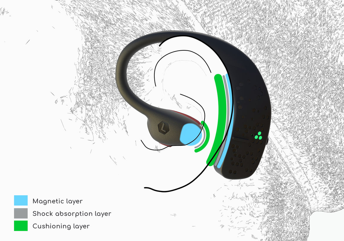 Earshots is a well-considered wireless headphone design. It stands out for its novel on-ear detailing in form and fit, and it’s magnetic “shock lock” to secure in place maintaining performance during shock and movement in action sport. This, coupled with strong ergonomic consideration, audio and power optimization, all loaded within a small compact action sport aesthetic - sets this New Zealand designed product apart in a very competitive global headphone market.