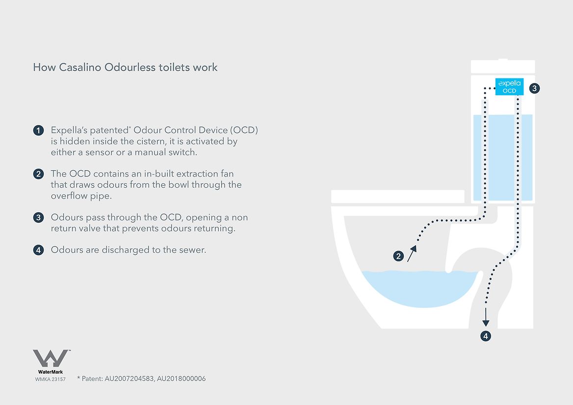 The Odour Control Device has the potential to fit any standard back-to-wall or in-wall toilet and has been launched to the New Zealand market with the Casalino back-to-wall toilet at a competitive price. The patented OCD has been recognised by Standards Australia and The Plumbing Code of Australia.