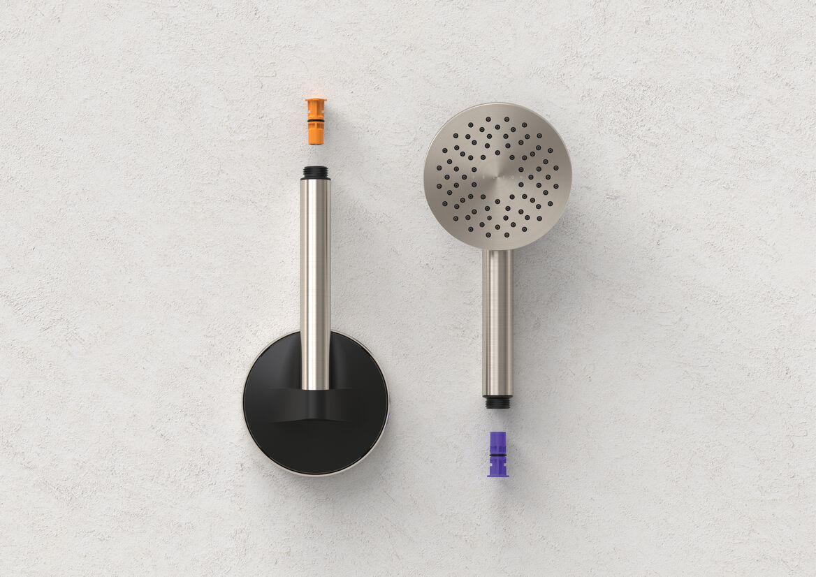 The Tate Aerlux™ handpiece was designed for modularity and can be broken into four components. The parts can be easily serviced, resulting in minimal carbon footprint through the manufacturing process. The faceplate and handle cover are made from 304 stainless steel which offers excellent corrosion resistance and strength. The tensile strength of the material allowed us to reduce the thickness of the plate to keep the overall weight of the handpiece to a minimum while still offering a sense of quality. Available as a standalone product, the handpiece is also available as a matching slide shower set within the Tate collection, with either a wet rail and dry rail option.