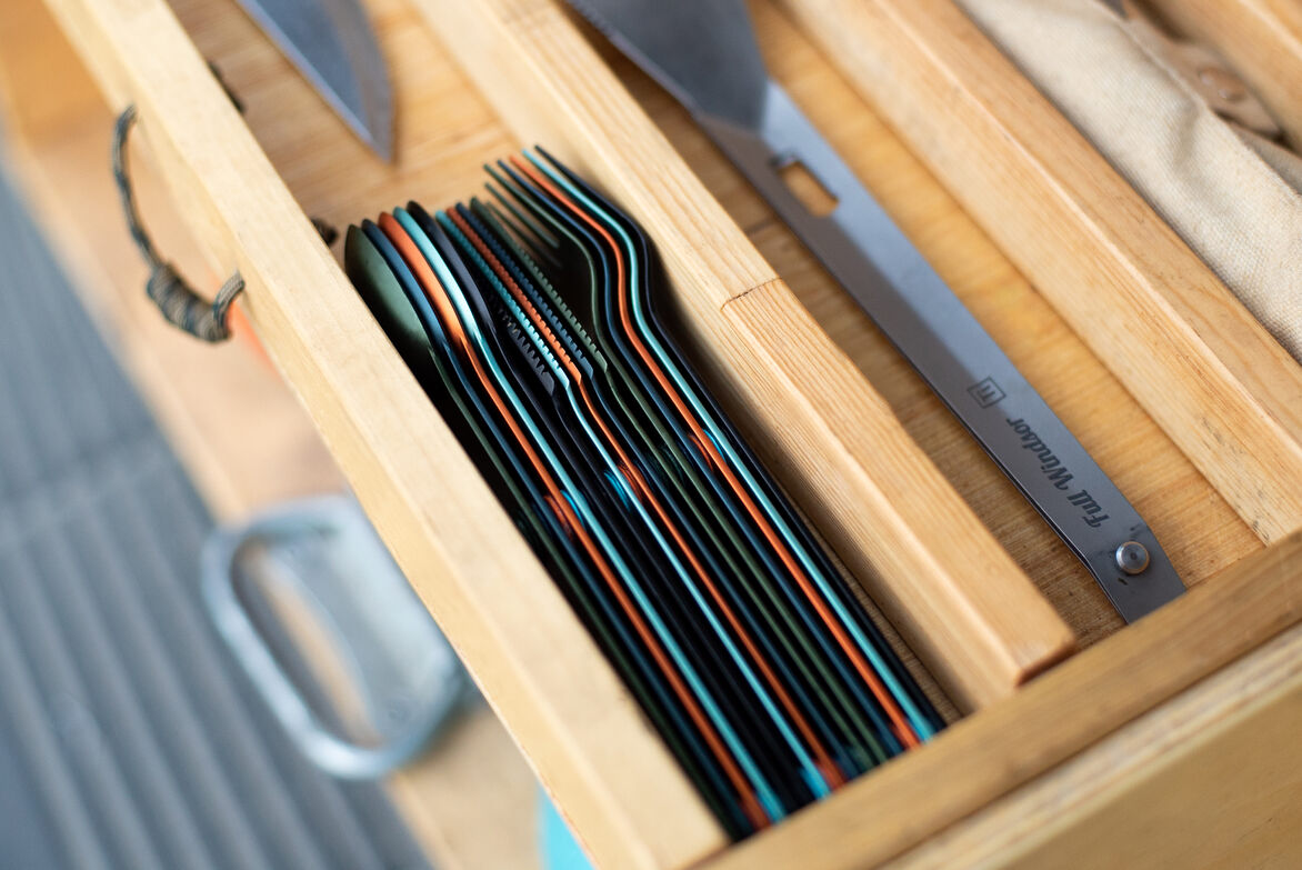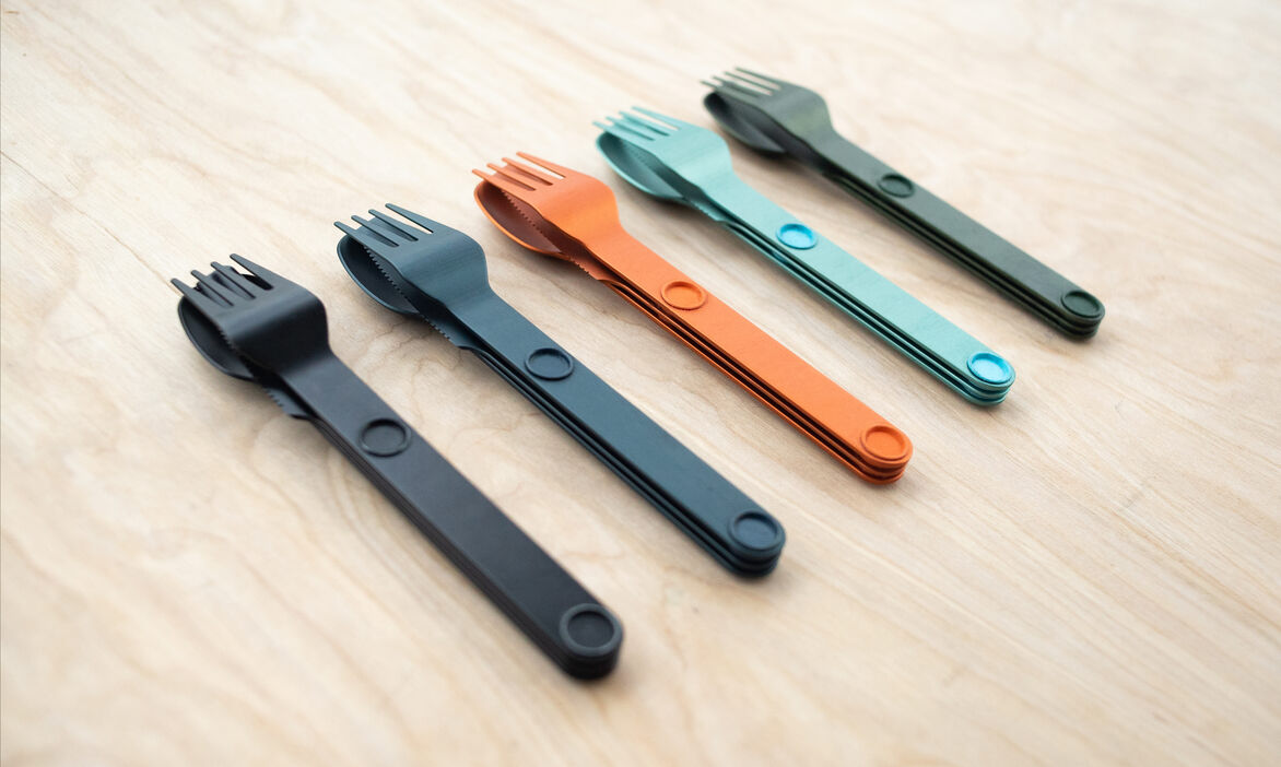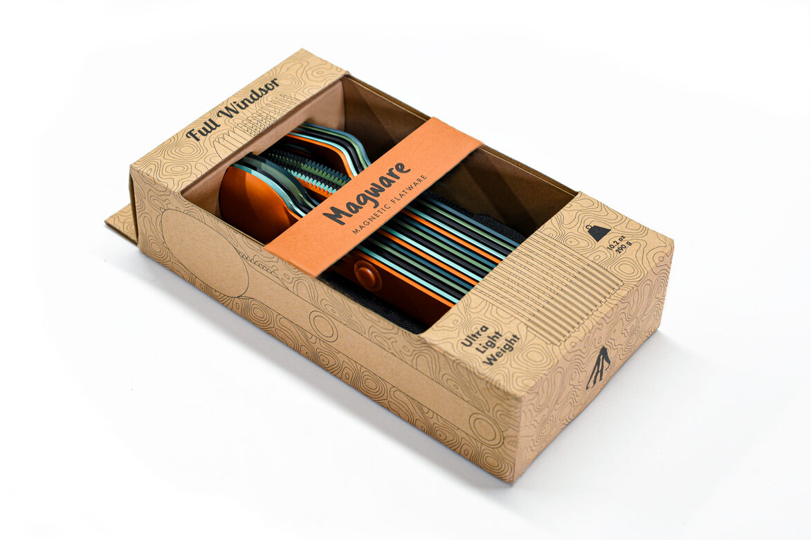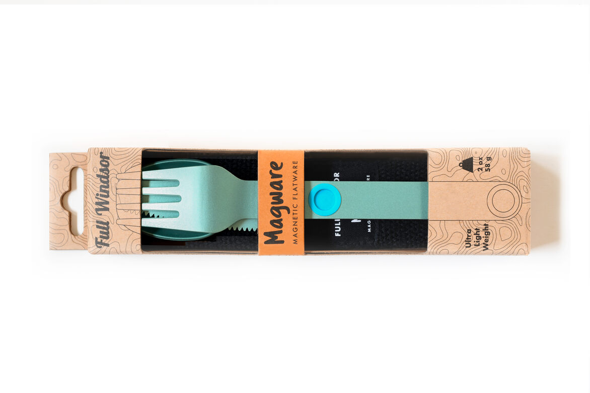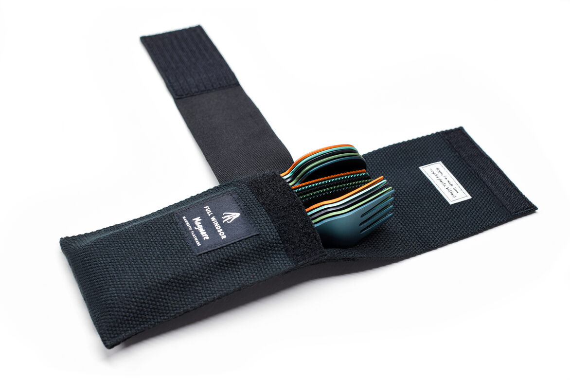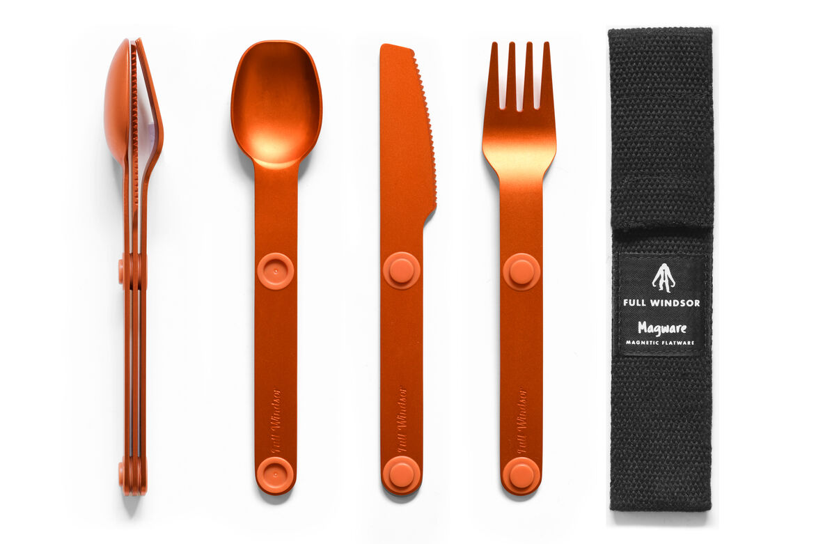 Magware Magnetic Flatware is ultra-light weight, strong and will last a life time. It is designed to go with you everywhere. Embedded magnets allow Magware to connect tightly together for secure packing and organized storage. This allows you to join as many sets together as needed for the family or group in one tidy bundle. Magware comes with a handy recycled polyester pouch (made 100% from recycled plastic bottles). It is perfect for travel, camping, picnics, offices and for use on the go. Magware is made from hard anodized 7075-T6 Aluminum, which has a better strength to weight ratio than Titanium and is fully recyclable.