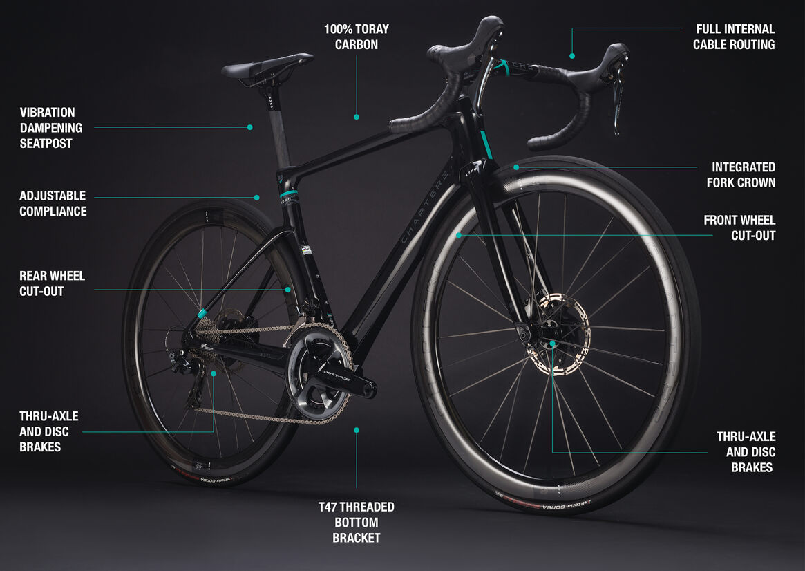 Further engineering gains have been achieved via the use of Latex Mandrels for the frame’s front triangle to carefully control the carbon fibre wall thickness during production. The inclusion of a T47 Bottom Bracket creates a super rigid platform for transferring every pedal stroke into exhilarating speed. Other well-considered details such as 32mm of tire clearance, vibration dampening Seatstays, and Seatpost makes for a package that ticks all the right boxes of a modern racing bike.