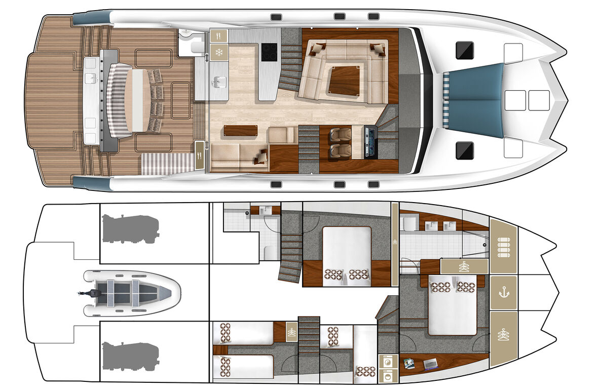 Timeless style lines composing the boat’s architecture envelop a wide, luxurious interior saloon space thanks to the wide beam (6.3m) offered from the multi hull platform. Comprehensively equipped for adventure, the Xpedition Foiler’s arrangement and low stance blurs the boundary with the water’s edge, offering virtually seamless connection with local surroundings. The wide beam offered by the multi-hull provides a large saloon space to enjoy open plan festivities. Two seating areas fore and aft blend with the spacious galley and helm, disguising stairwells to the cabin deck amidst. Consciously designing for social entertainment, the forward main lounging area runs adjacent to the near uninterrupted panoramic view from the helm, so that skippers are weaved in with the communal activity of the vessel.
