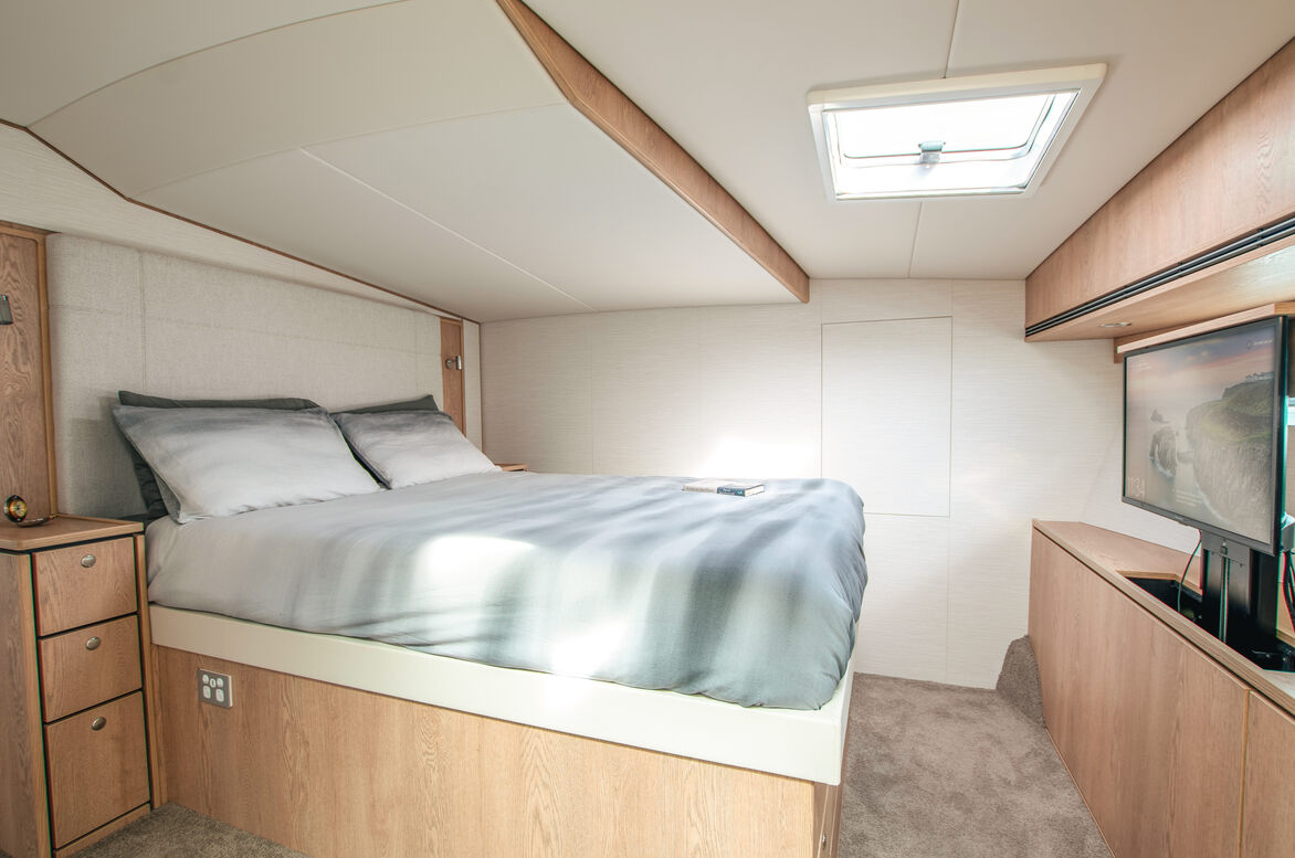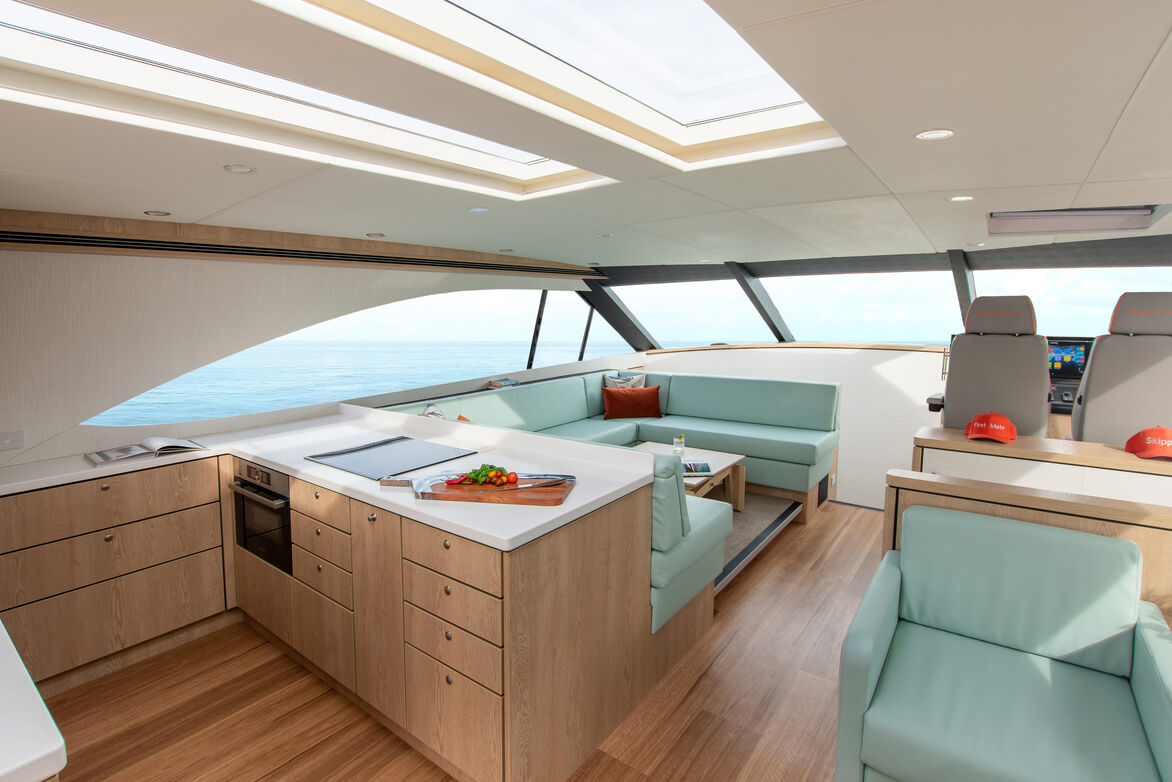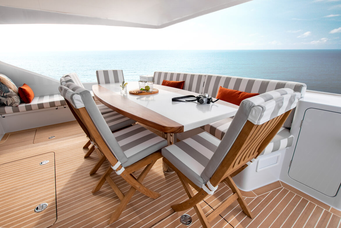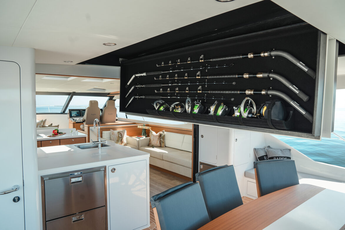 The dining area situates aft in a generous enclosable cockpit area. We aimed to offer a space from which to connect with the surrounding seascape whilst enjoying your dining experience, in any weather. Utilities such as salt ice makers and dive compressors in conjunction with foldaway rod lockers aid in providing exciting ocean experiences for when the time to relax is passed. Direct access to the water is made easy to the owner’s desire with a hydraulic transom platform, which can be utilised for eased launch of the tender or fishing/diving/swimming purposes.