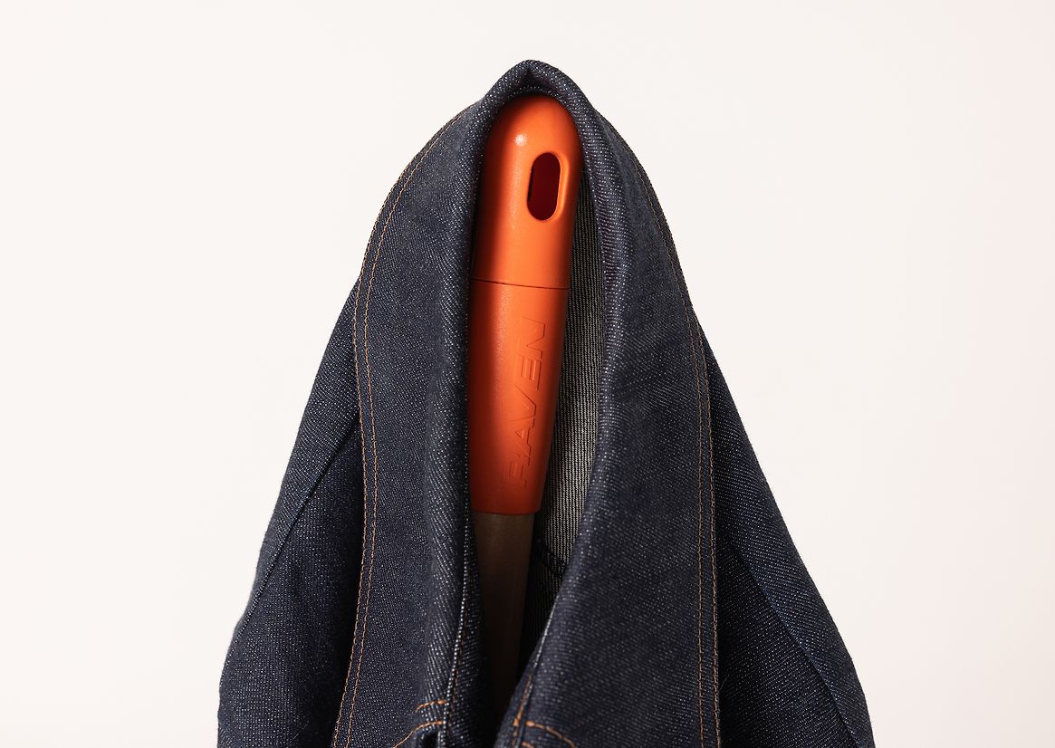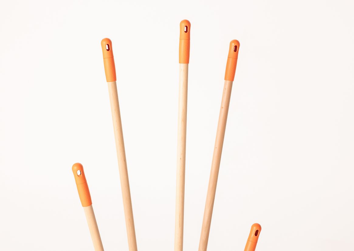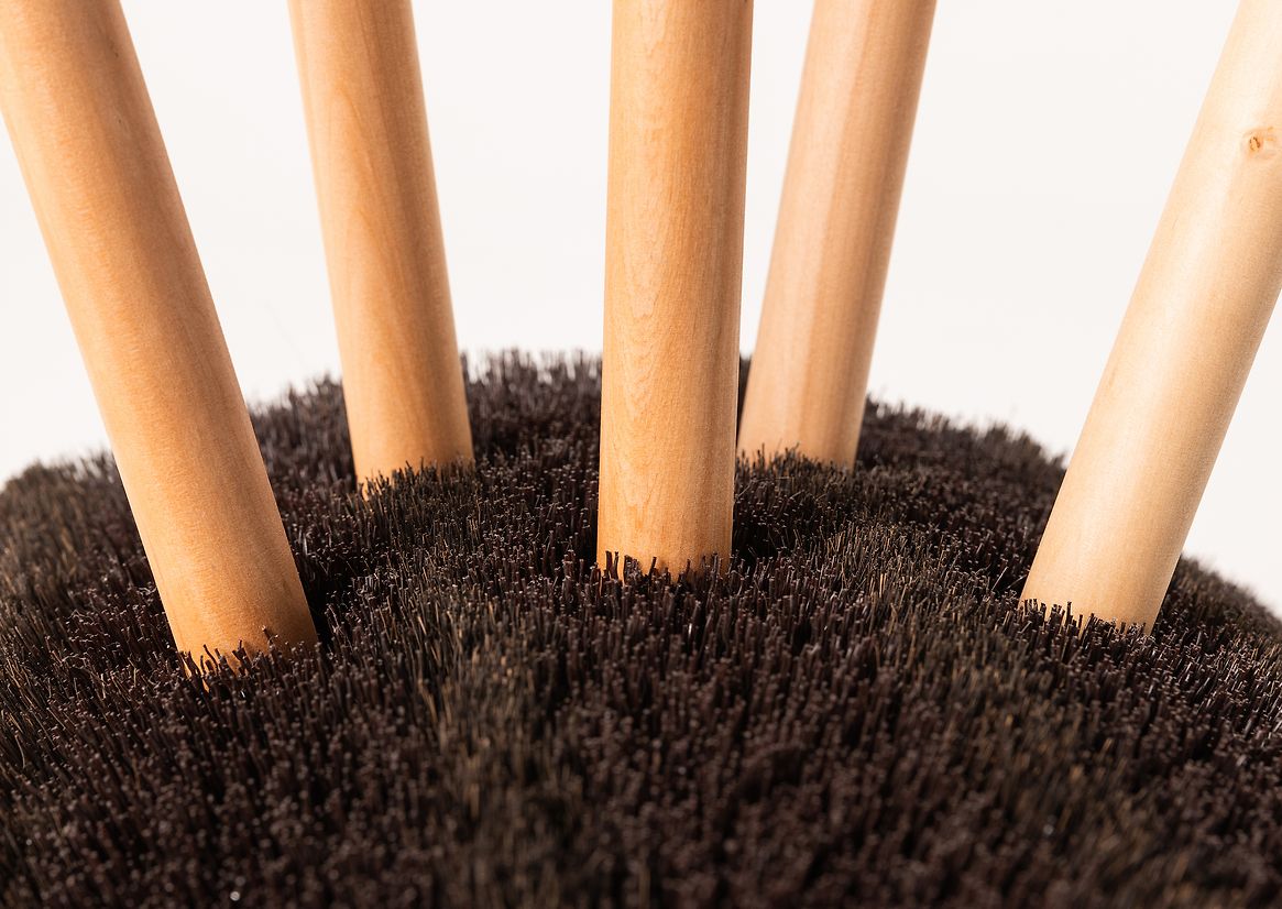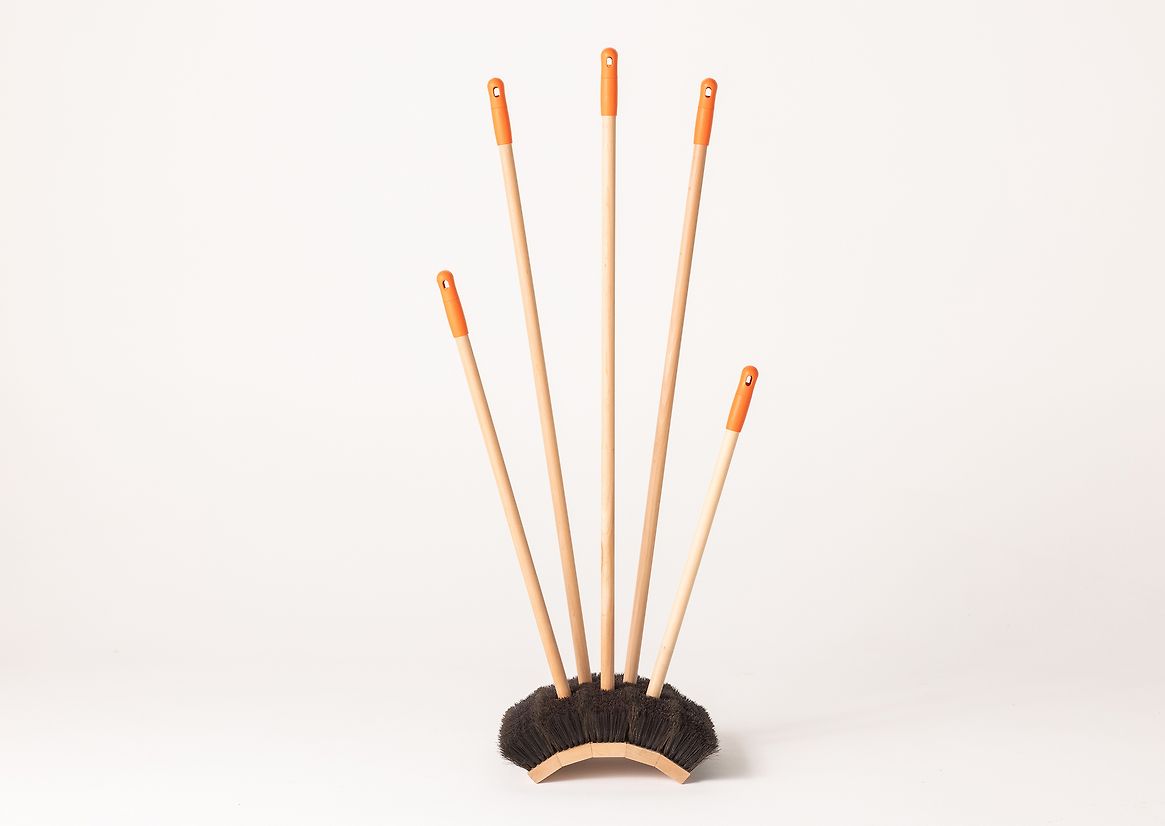 The coat rack celebrates the humble materials of the broom, which was designed and made by Raven Products in New Zealand. Indonesian Arenga fibre bristles are directly contrasted with the New Zealand Southern Beech timber handles. The orange moulded plastic caps are also kept on display as they are perfect for hanging garments, and signal back to the original product.