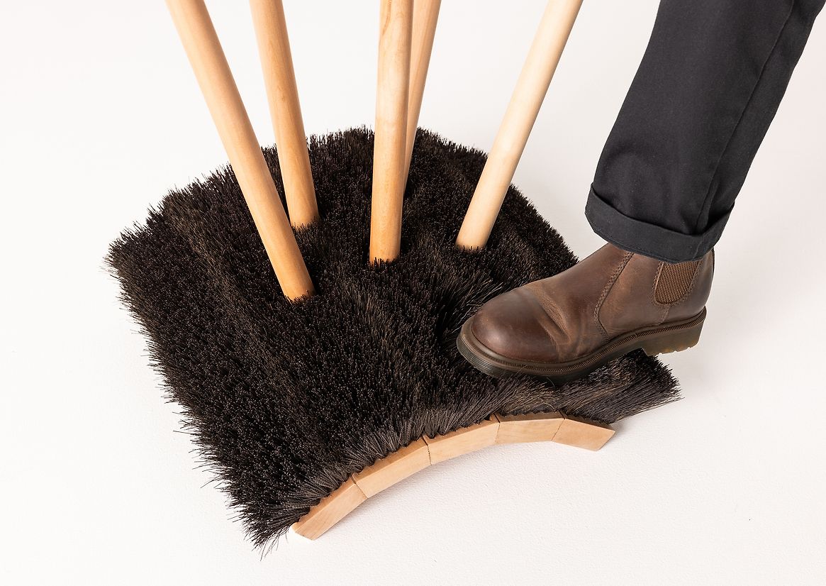 Broom is composed of 5 common hardware store brooms that are rearranged to offer a new function. The angled sides of the broom heads naturally create an arched base, with an array of broom handles set at a range of useful heights for hanging and grasping. The handles emerge from a forest of inverted bristles that can be used as a boot cleaner.