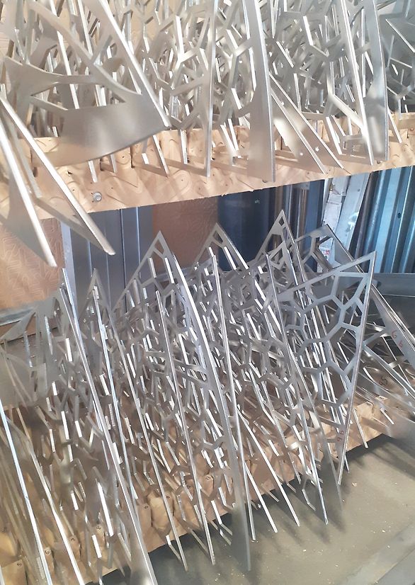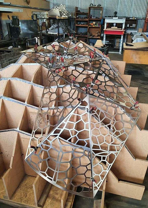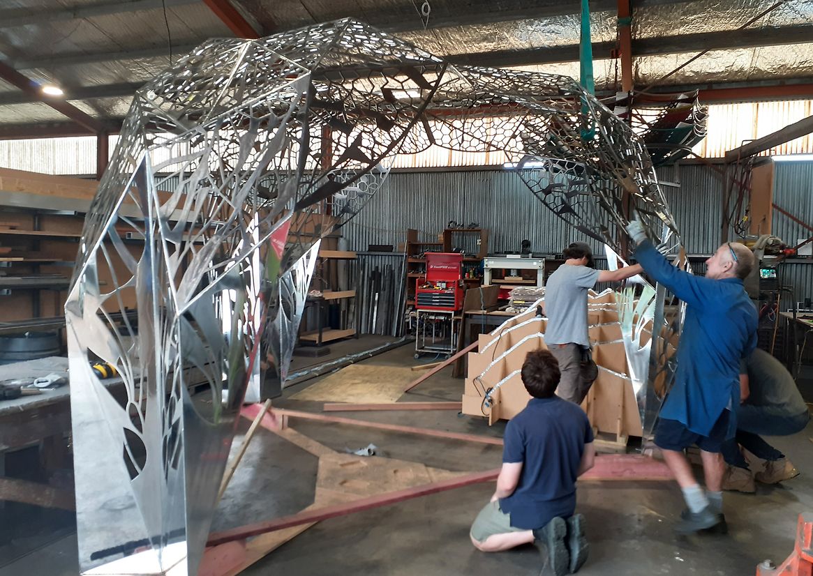 Tipua is built from 84 individual parts of 6mm thick 316 stainless-steel, laser-cut, hand-polished and welded together on specific angles. After cutting, the steel was electropolished to get a mirror finish, but because of the varying areas of steel this process was inconsistent and patchy. So the whole thing had to be laboriously hand-polished.