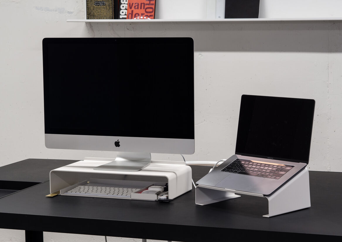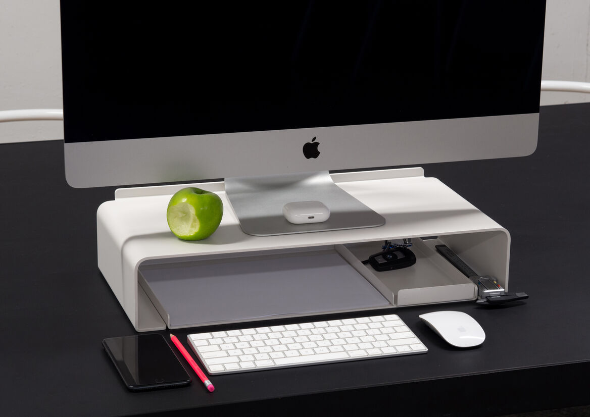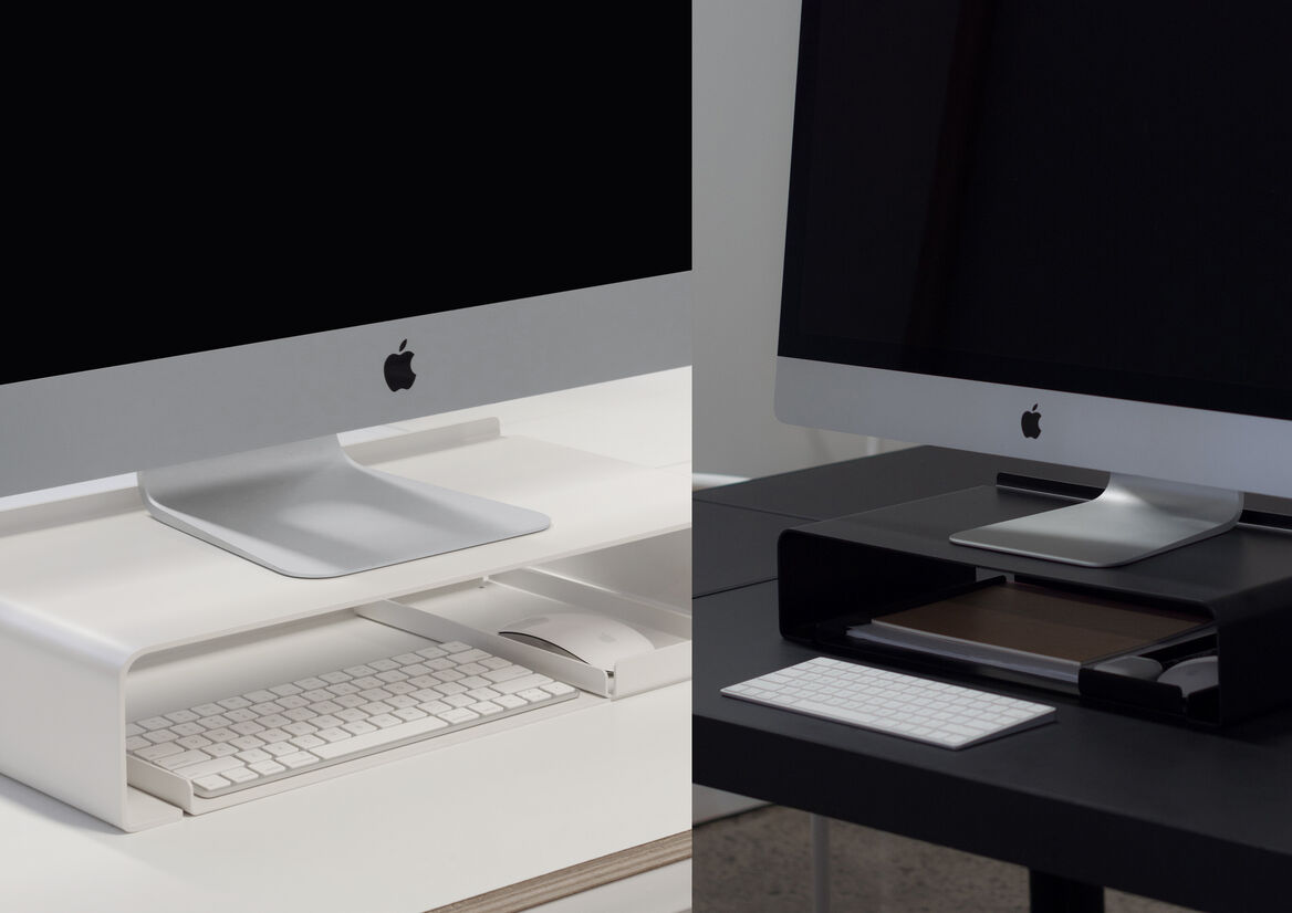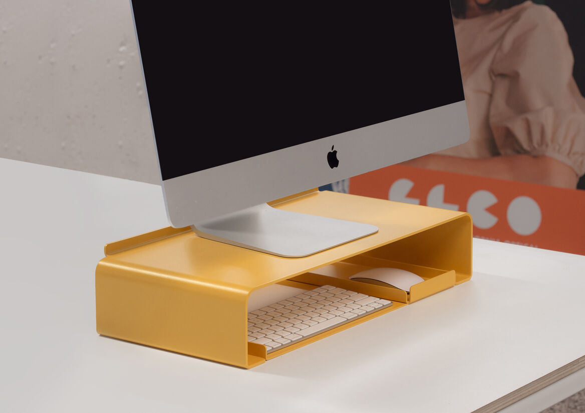 The complete Work Station includes a powder-coated aluminum monitor stand with a large & small undertray. The Monitor Stand elevates your screen to a more optimal viewing height whilst providing space for the large & small tray that fits nicely underneath. The trays can be used to store your loose papers, stationery, phone, wallet, keys in an organised manner.