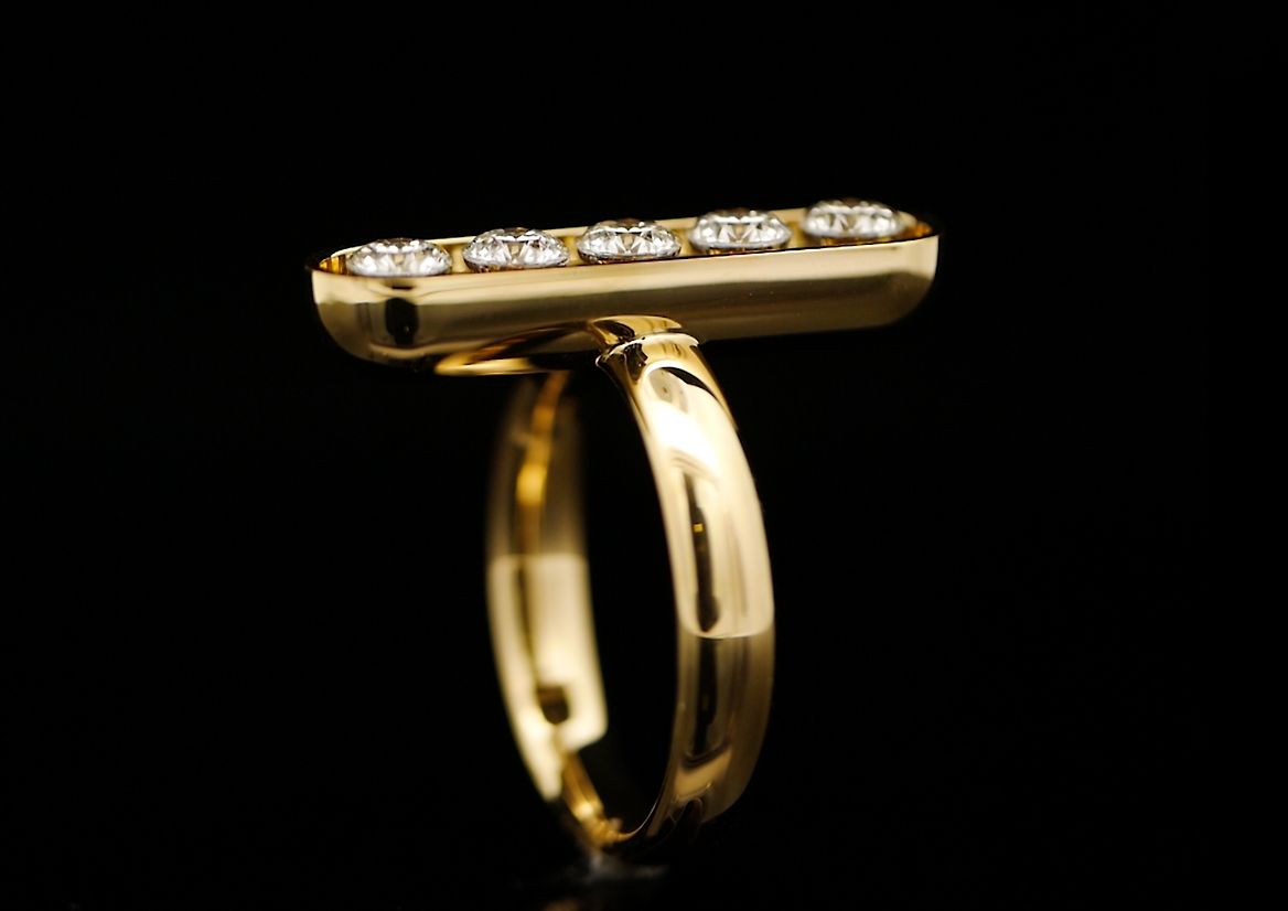 Our client for The Floeting® Diamond Vessel ring asked us to create a streamlined, soft, organically-based form to showcase 5-diamonds in a line to their maximum light performance levels while simultaneously achieving a highly wearable and streamlined object they would feel comfortable wearing in every circumstance.