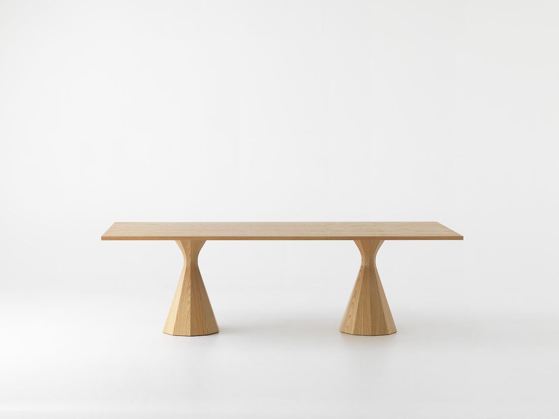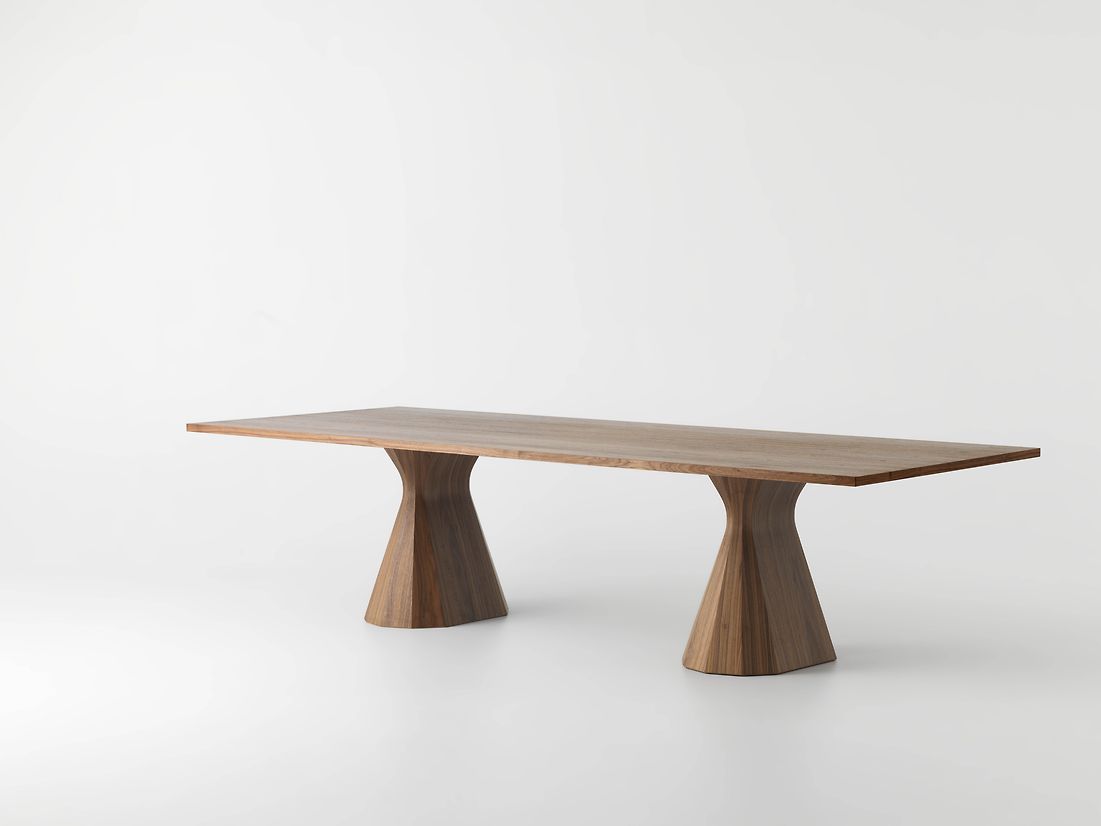 With a distinctively feminine form, the Ballerina is an elegant and graceful table. Ten neat pleats fall from the waist of each pedestal, a gravity defying lightness rendered in wood. The original pedestal is joined by a second larger version, and together they present a collection of both single and twin pedestal tables, in six variations.
