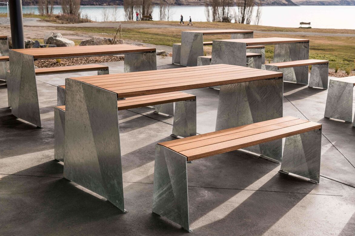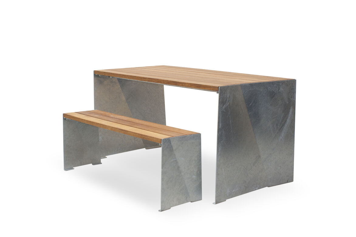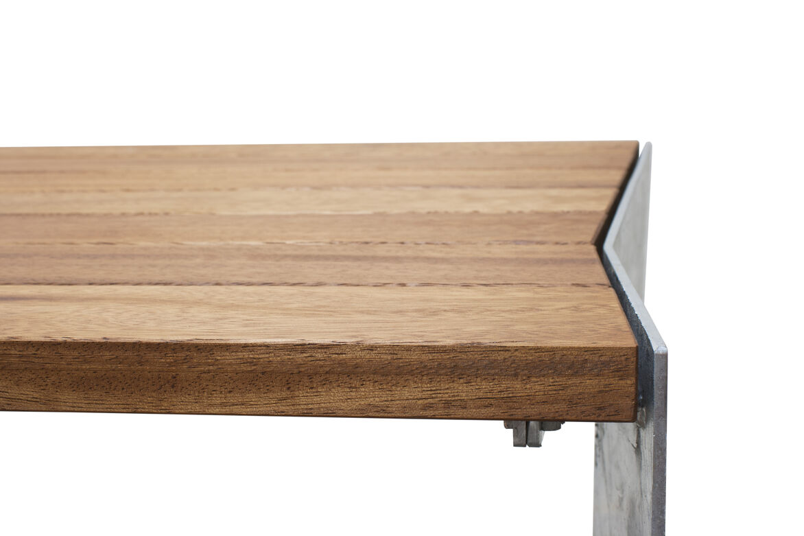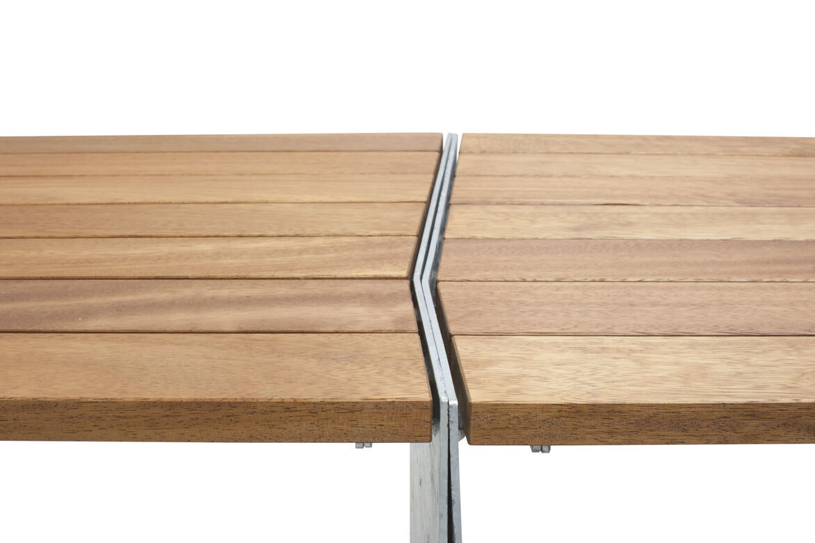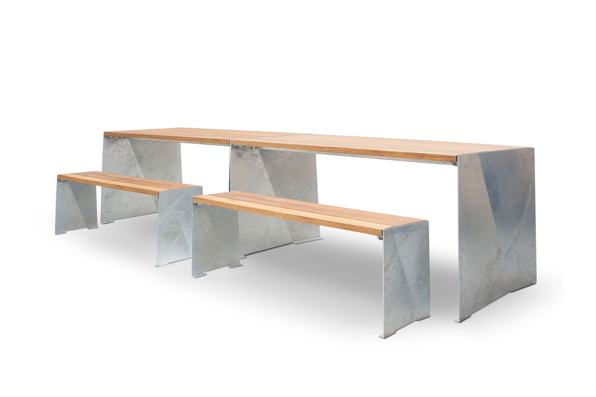 The Design Inspired by the way a single fold can transform a piece of flexible paper into a ridged form, the steel plate ends with a matching fold in each results in a unique design without any vertical lines. The angled fold creates interesting lines from every perspective and yet each end has the fold on the same orientation which allows for tables to be placed seamlessly end to end. A low profile steel frame supports the top slats with a end fold design to provide lateral strength when bolted to ends without the need of lower bracing struts. Tops are made from solid Iroko timber which is FSC certified with an oiled finish and all steel components are hot dip galvanised resulting in an attractive table design that will withstand all elements. Available with a matching bench seat.