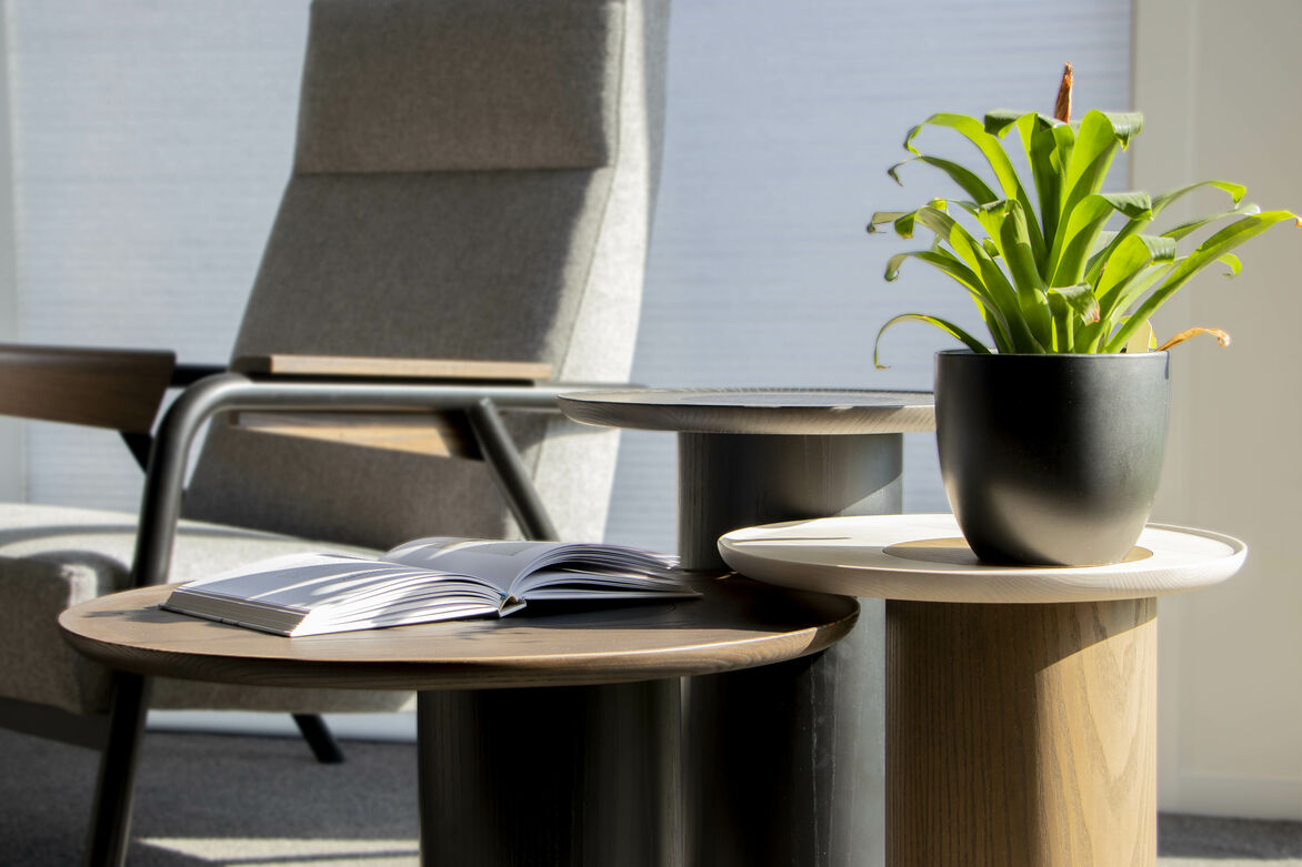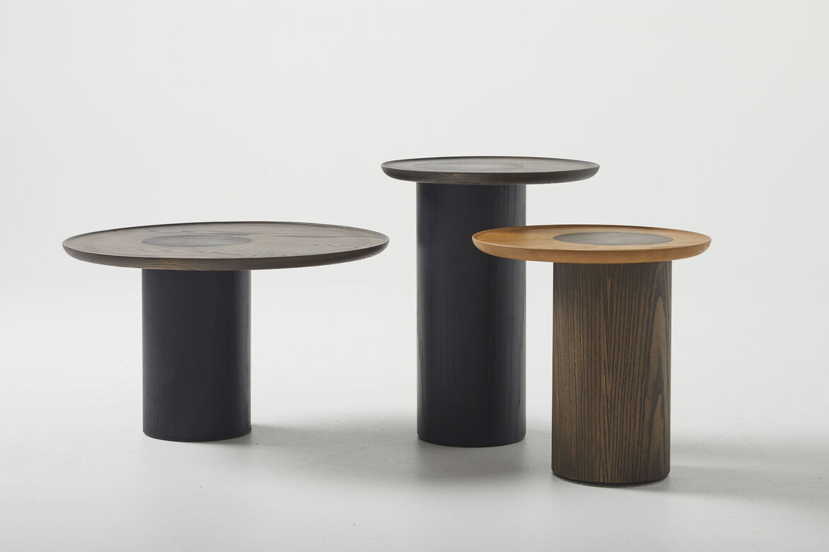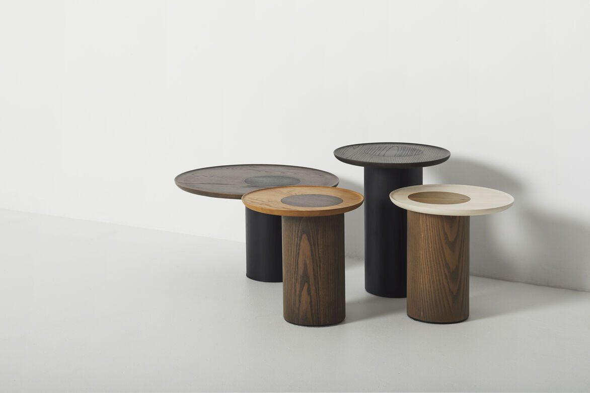 A collection of distinctive occasional tables that can be grouped together at different hights and sizes to create a functional focal point in lounge and reception settings.