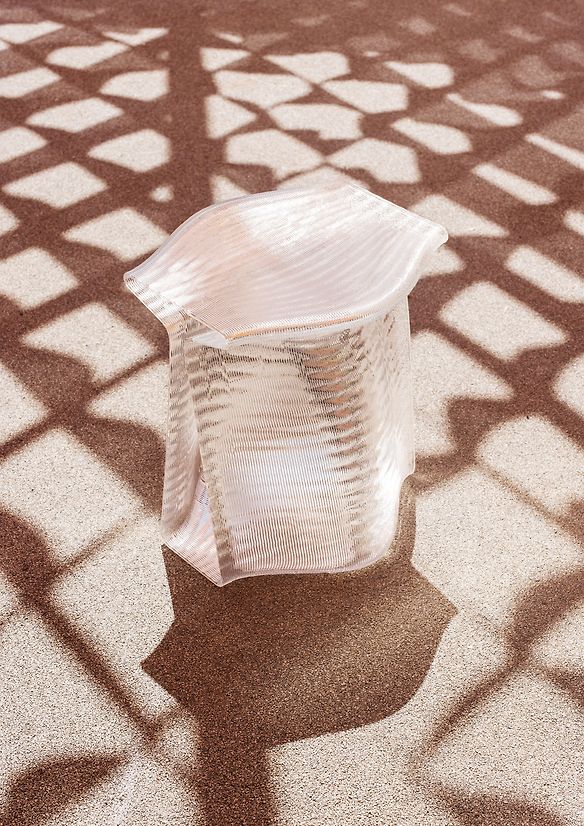 Drawing inspiration from the billowing and cellular forms of all(zone)’s MPavilion 2022 design, Canberra Design Lab created a stool with a complex doubly-curved shape, enhancing its stability and offering a combination of support, flex and suspension in all the right places. The translucent yet highly textured surface animates the seat, amplifying its presence under the MPavilion 2022’s vibrant canopy through flickering plays of light while casting spectrums of colour.