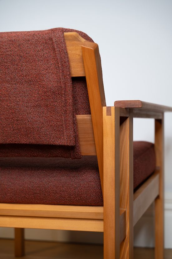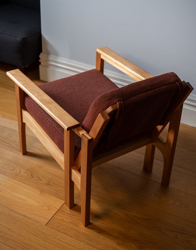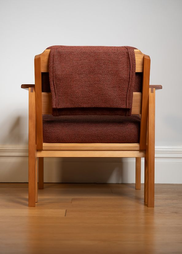 The chair is upholstered in Kvadrat Ecriture, a fabric which has colours influenced by ceramic glazes. It was specifically chosen for its organic texture and colour which complements the warm tones of the Kauri. The sling holding the back squab features bound edges, reflecting the way I finish the fly pieces in the jeans I make.