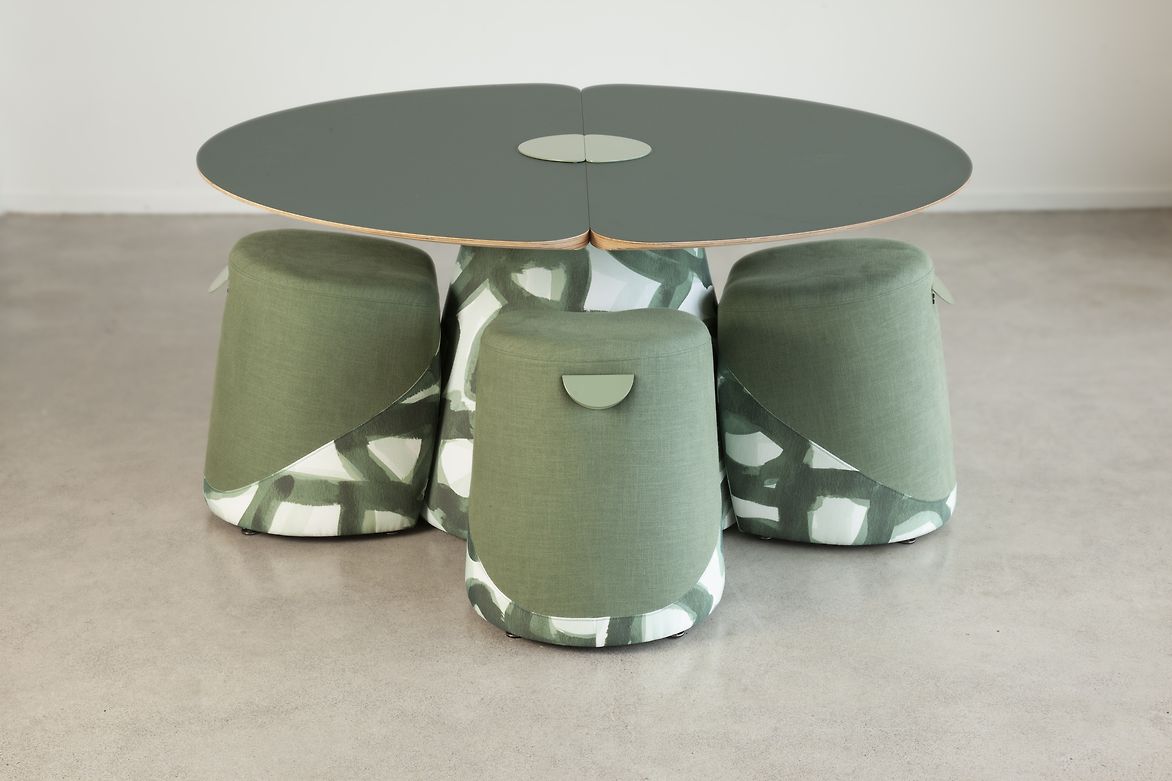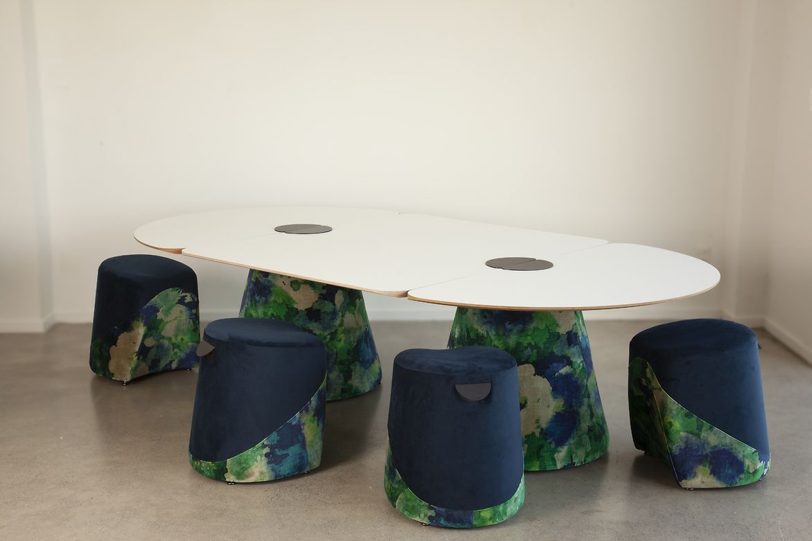 The resulting table and ottoman set is both playful, eminently usable, naturalistic and flexible, whispering loudly for attention in your space.